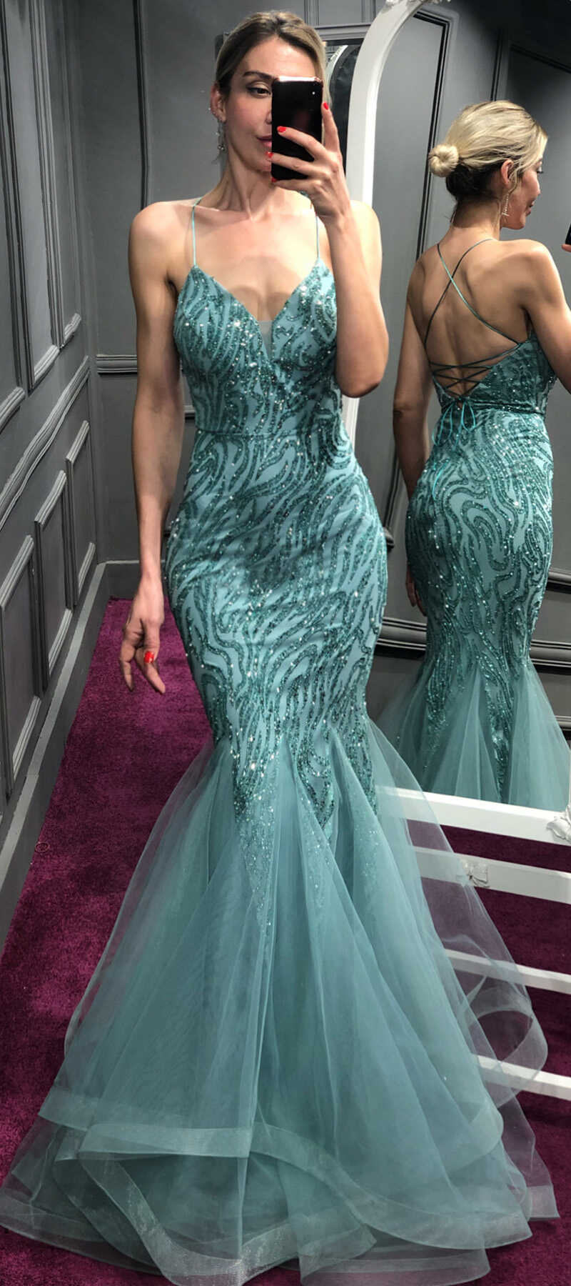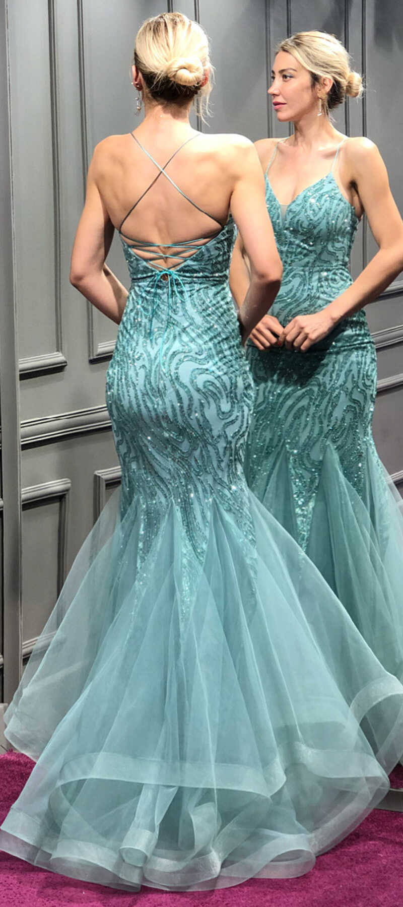 Mint Renk Balık Etekli Uzun Abiye Elbise, Simli Kumaştan Üretilmiş Olup Simlerin Işıltısıyla Çok Hoş Gözükeceksiniz Elbisedeki İp Askılar Kullanım Kolaylığı Yaratacaktır. Şık Sırt Dekoltesi Size Çok Yakışacak.