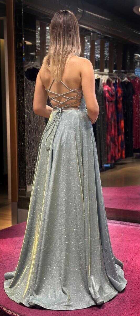 Mint İp Askılı Sırt Dekolteli Kloş Etekli Simli Uzun Abiye Elbise 7601