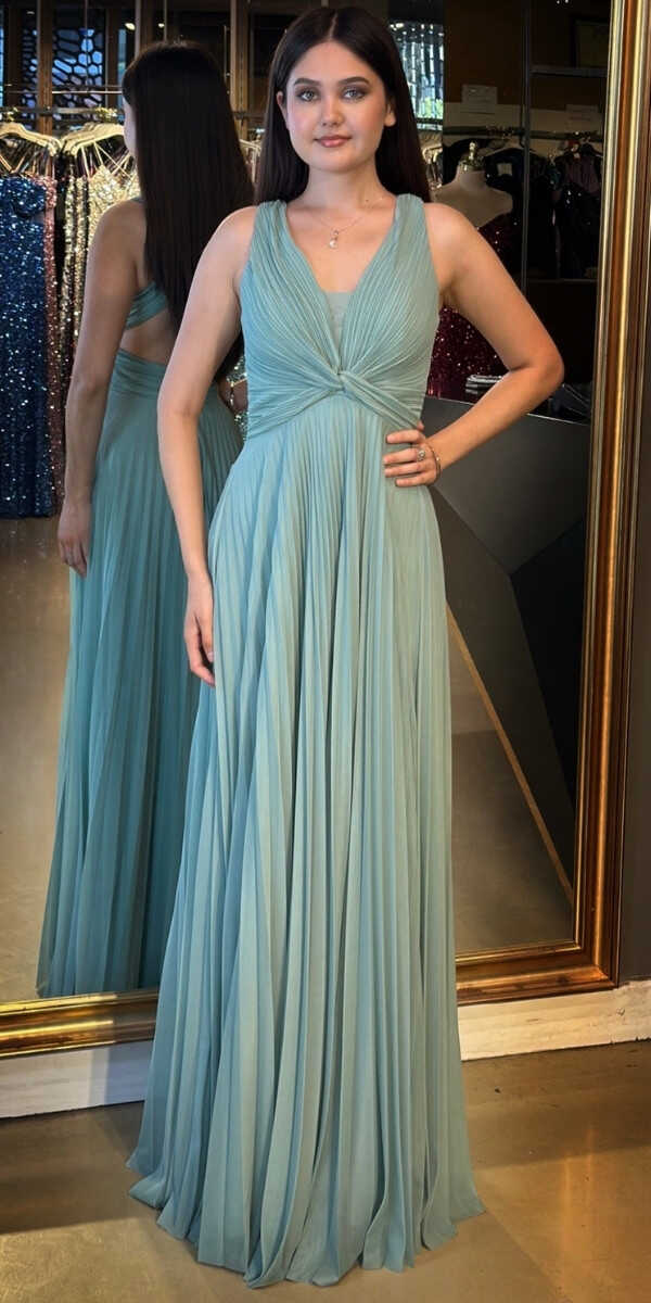 Mint Renk Kloş Etekli Uzun Abiye Elbise, şifon tül Kumaştan Üretilmiş olup Chiffon Tulle Şık Sırt Dekoltesi Size Çok Yakışacak.