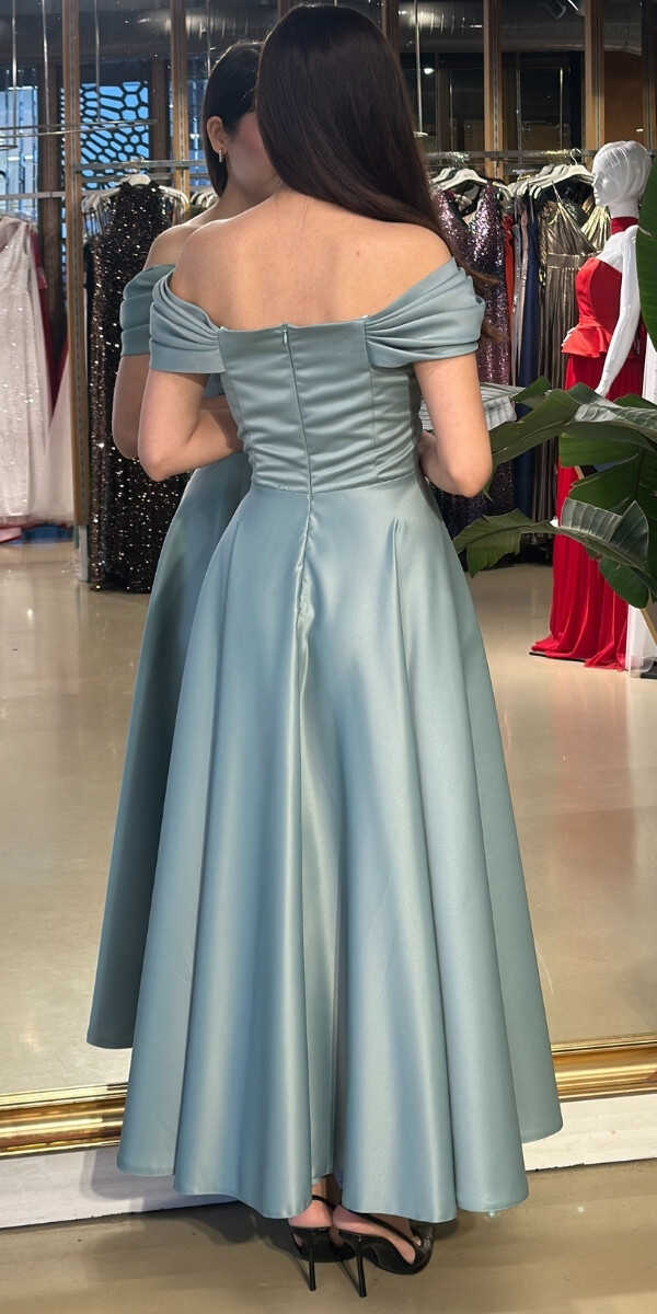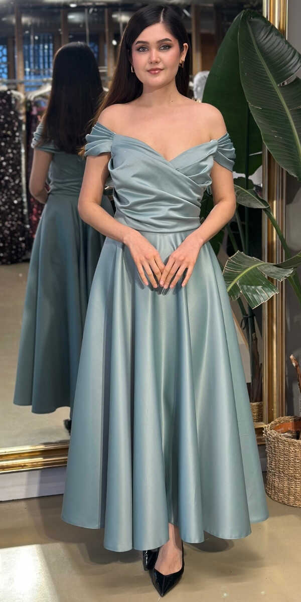 Mint Madonna Yaka Kloş Etekli Saten Midi Abiye Elbise 7672