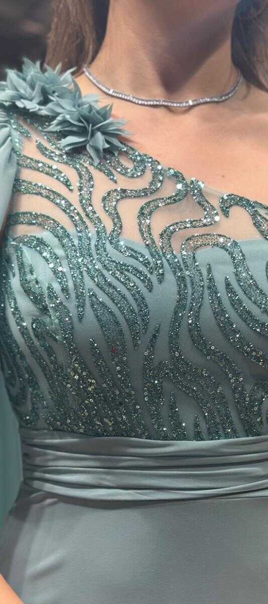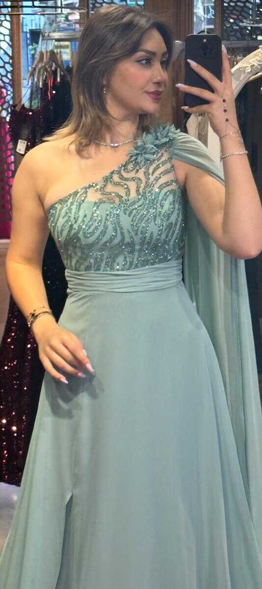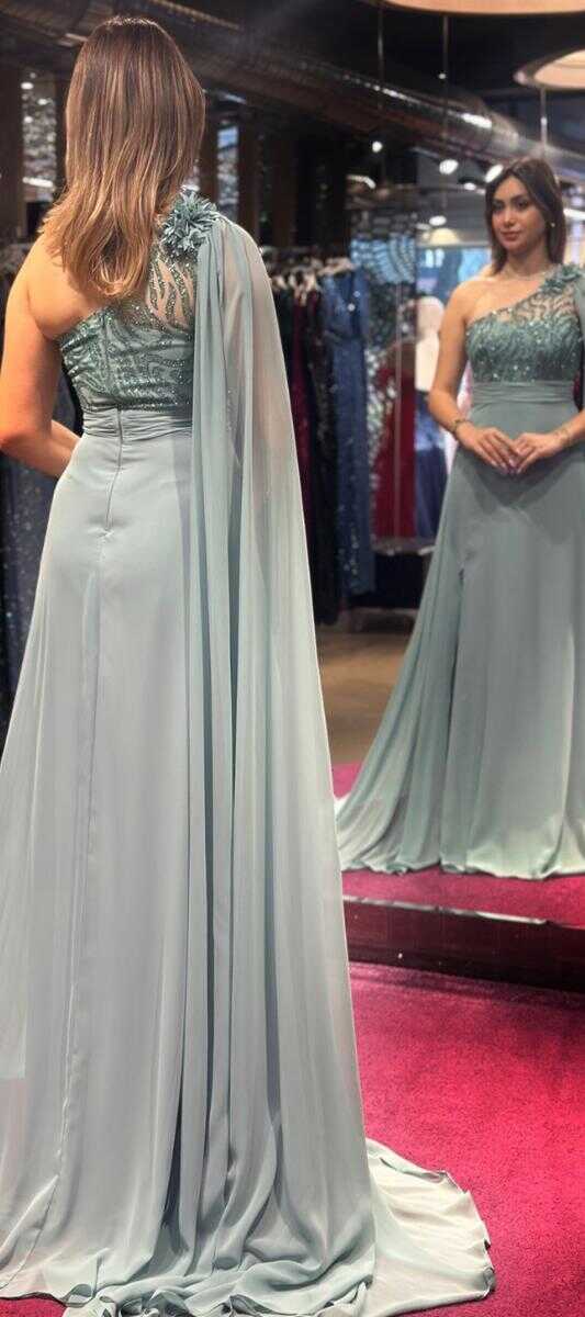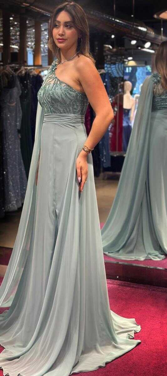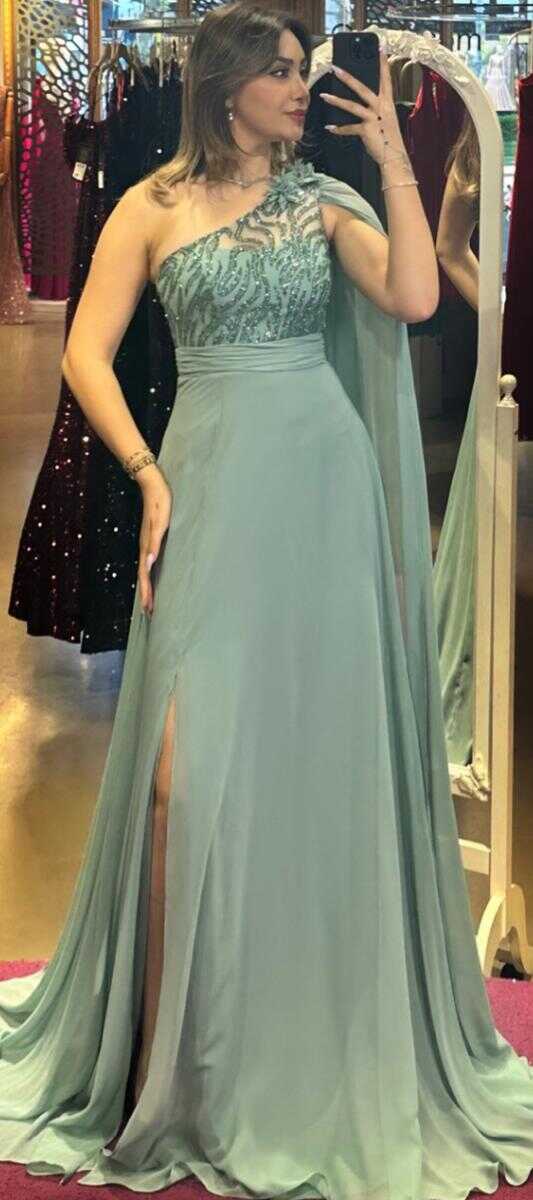 Mint Tek Omuzlu Çiçek Detaylı Yırtmaçlı Kloş Etekli Şifon Uzun Abiye Elbise 7505
