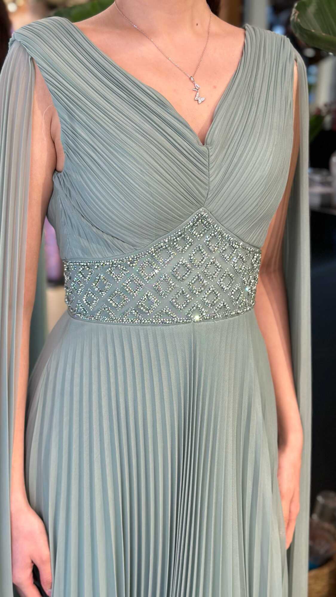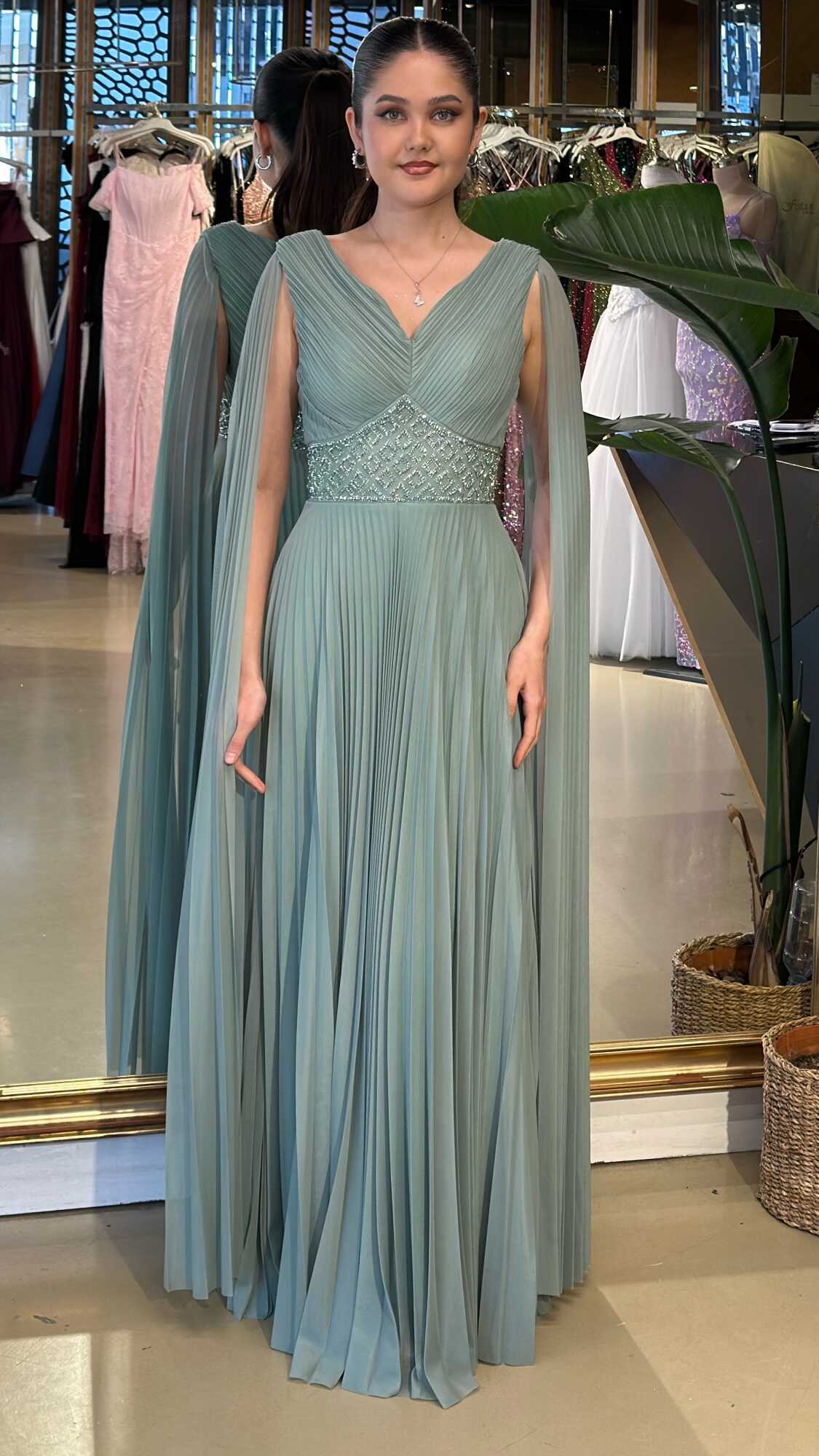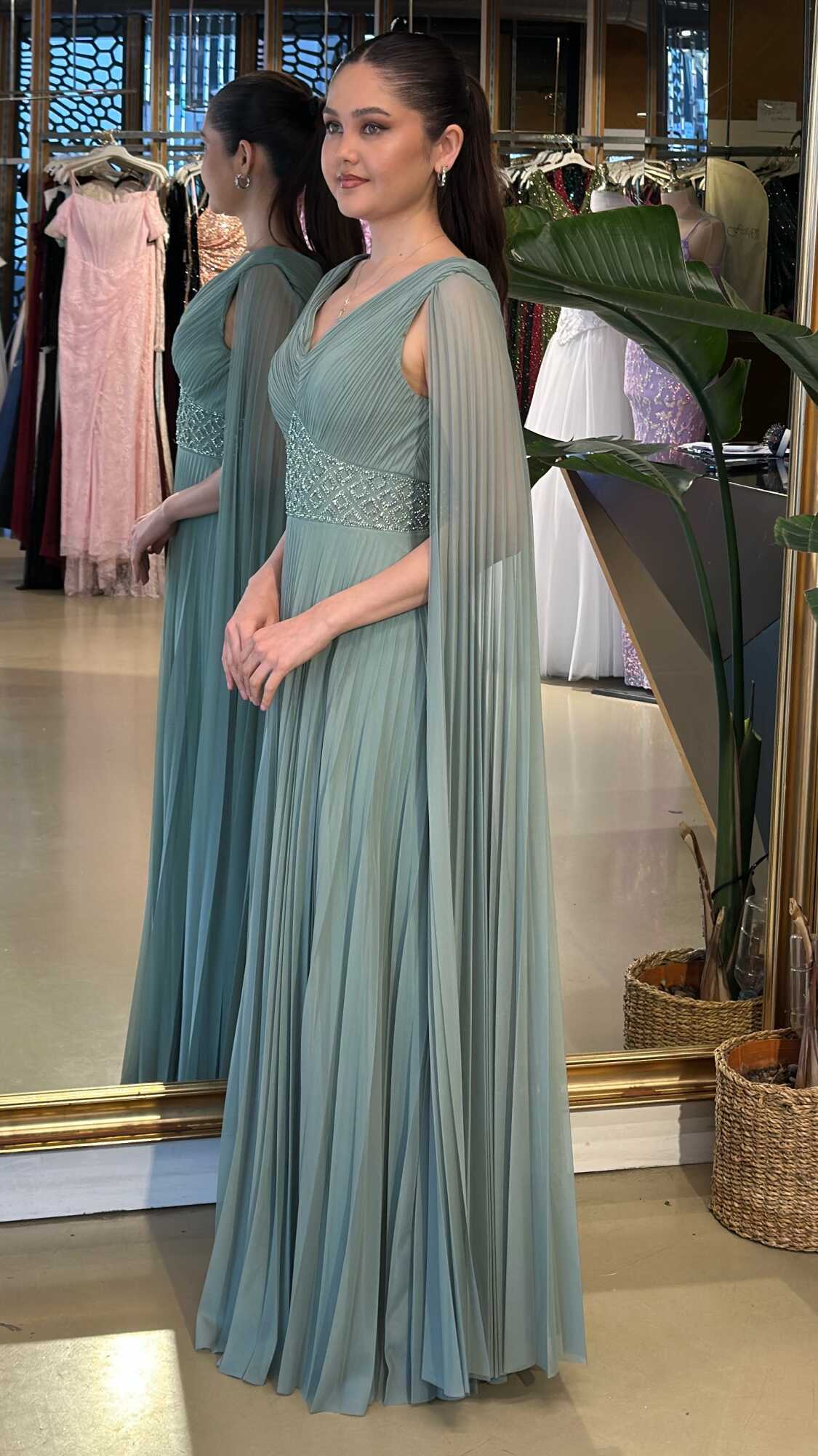 V Yaka Mint Renk Kloş Etekli Uzun Abiye Elbise, Şifon Kumaştan Üretilmiş olup Uçuş Uçuş Şifon Kumaş Tüm Dikkatleri Üzerinize Toplayacaktır. Çıkarılabilir peleriniyle iki farklı kullanım imkânı sunar.