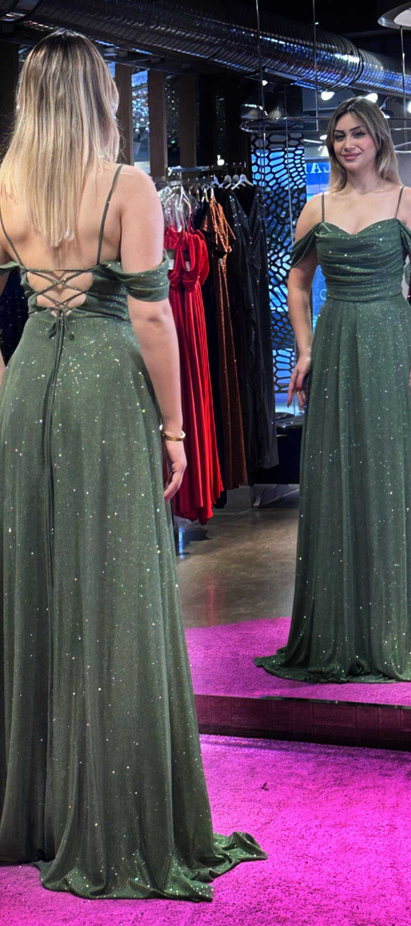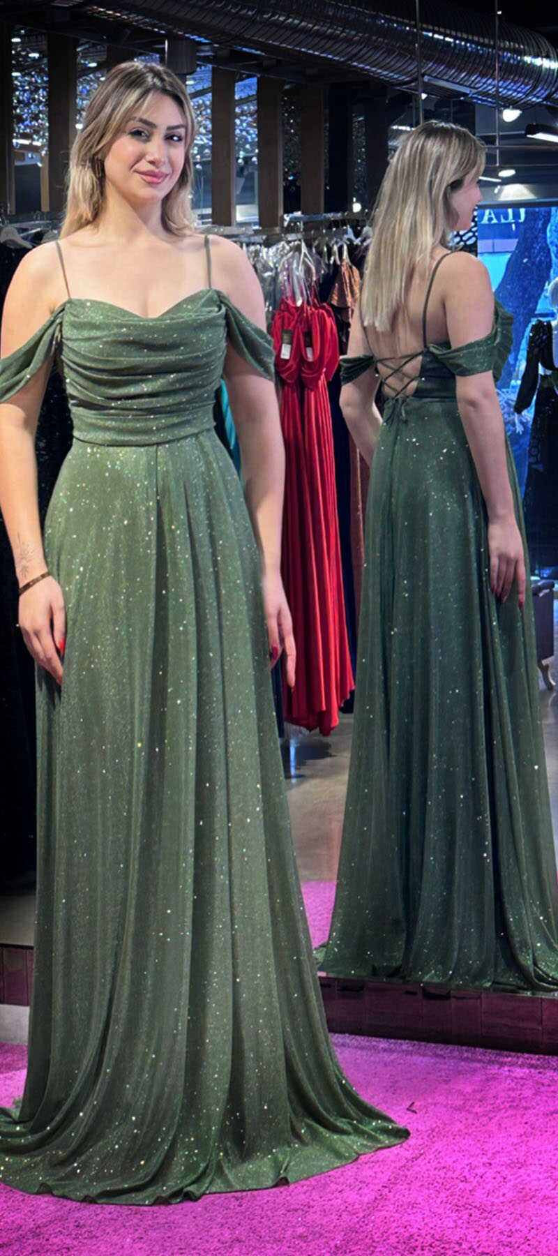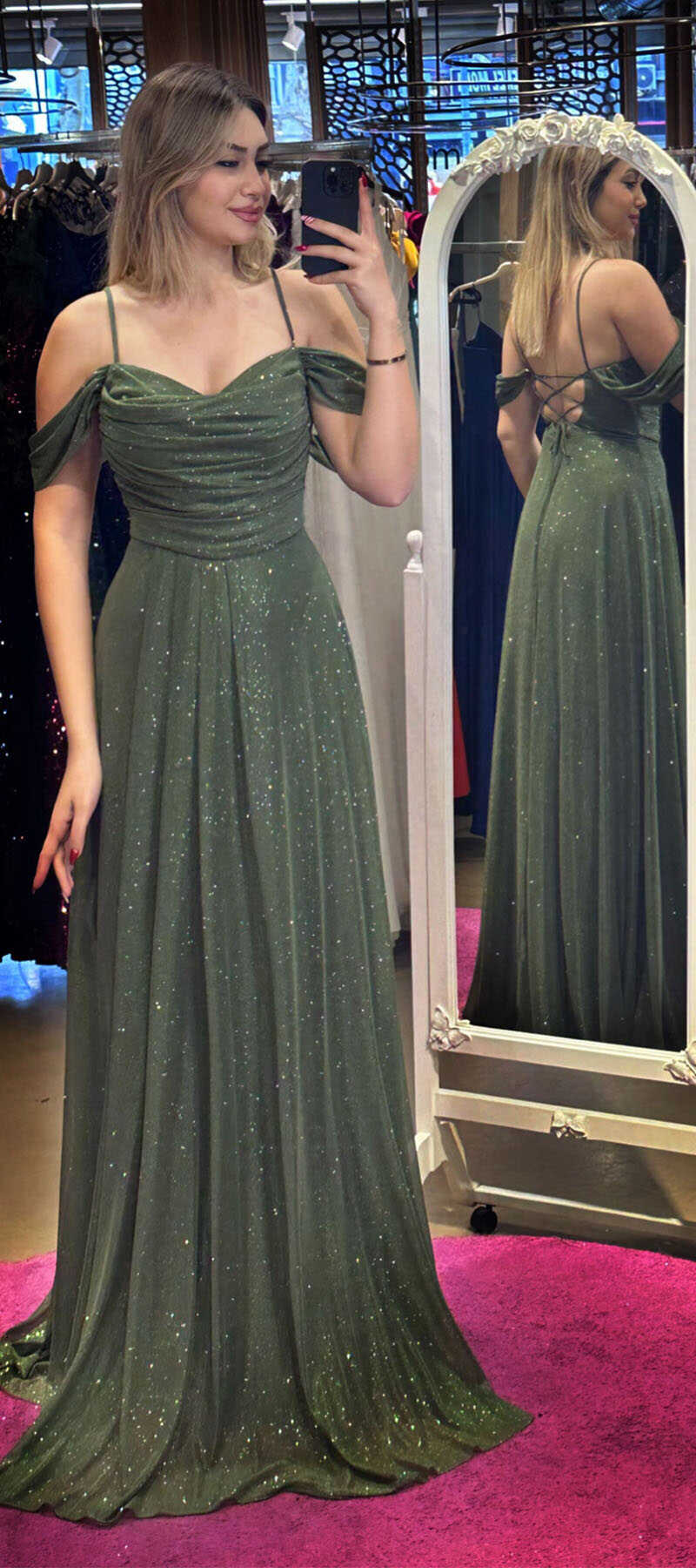 Olive Renk Kloş Etekli Uzun Abiye Elbise, Simli Kumaştan Üretilmiş Olup Elbisedeki İp Askılar Kullanım Kolaylığı Yaratacaktır. Şık Sırt Dekoltesi Size Çok Yakışacak.