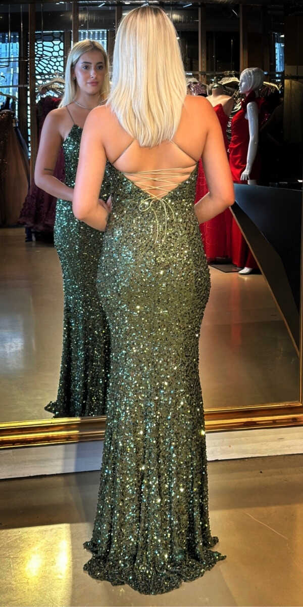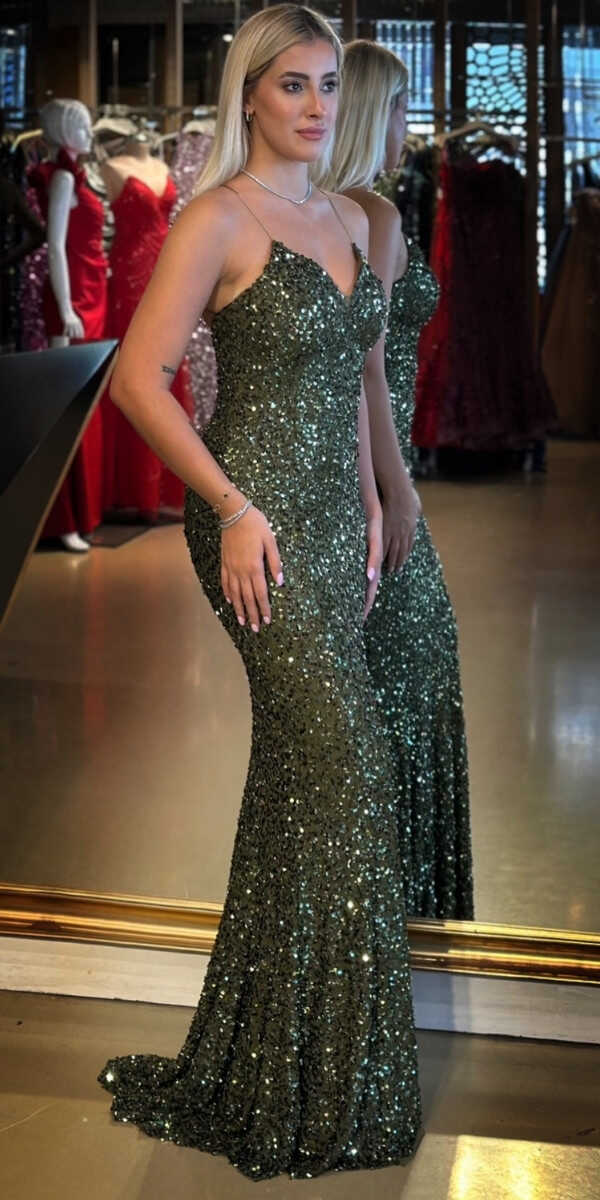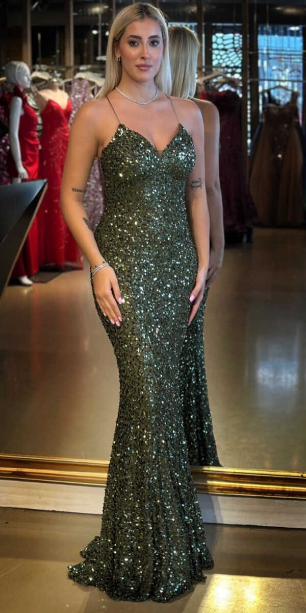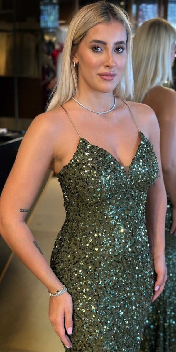 Olive Renk Balık Etekli Uzun Abiye Elbise, Pul Payet Kumaştan Üretilmiş olup Likralı ve Payet İşlemeli Kumaşı, Dikkat Çekici Işıltısının Yanı Sıra Vücudunuzu Sararak Sizi Olduğunuzdan İnce Gösterecektir. Elbisedeki İp Askılar Kullanım Kolaylığı Yaratacaktır. Şık Sırt Dekoltesi Size Çok Yakışacak.