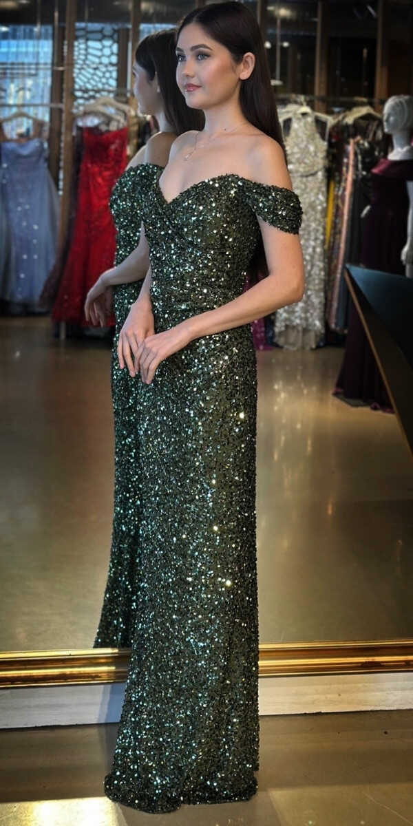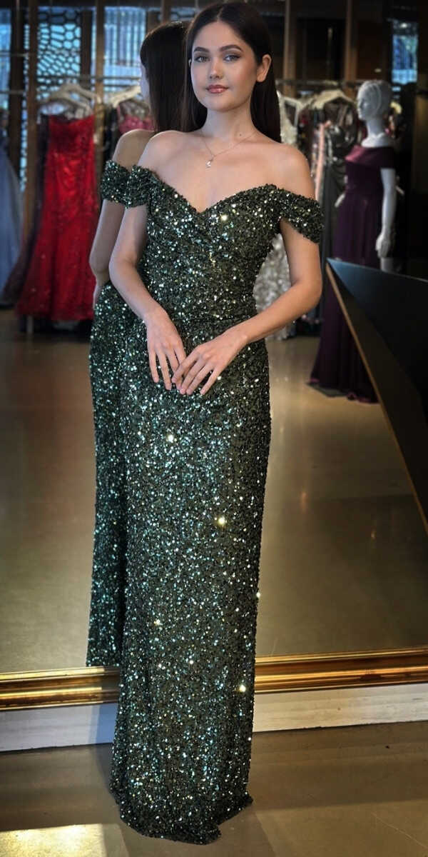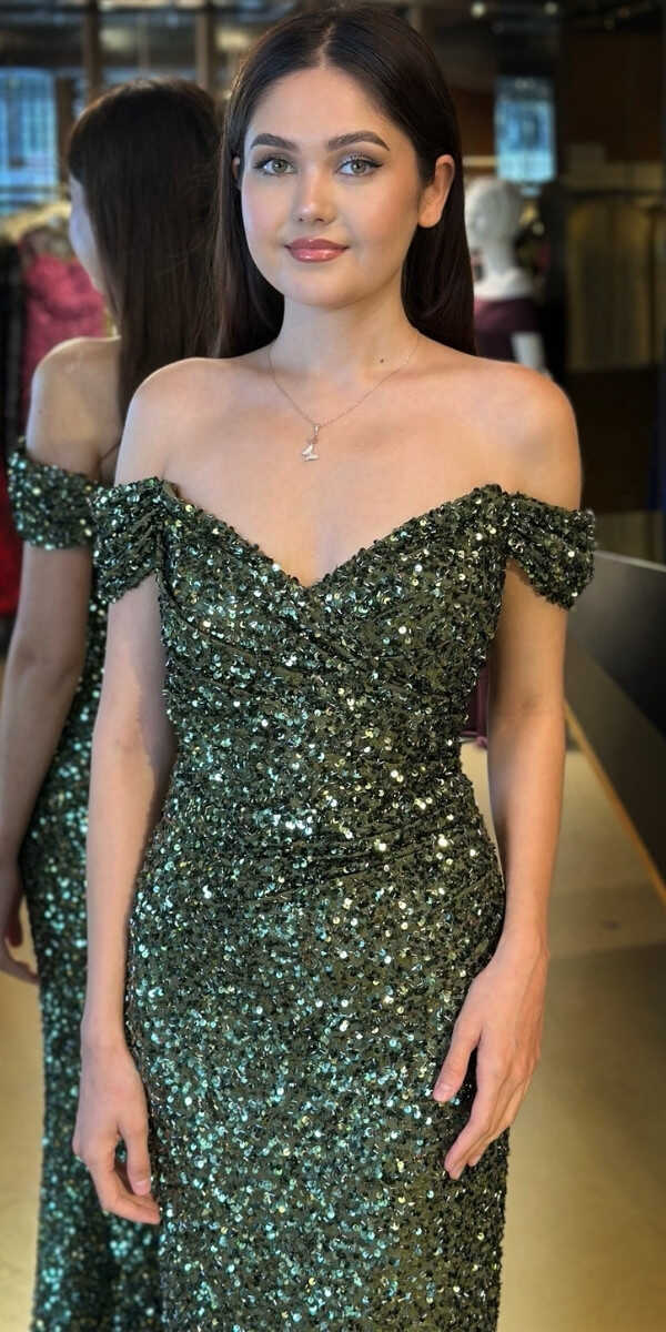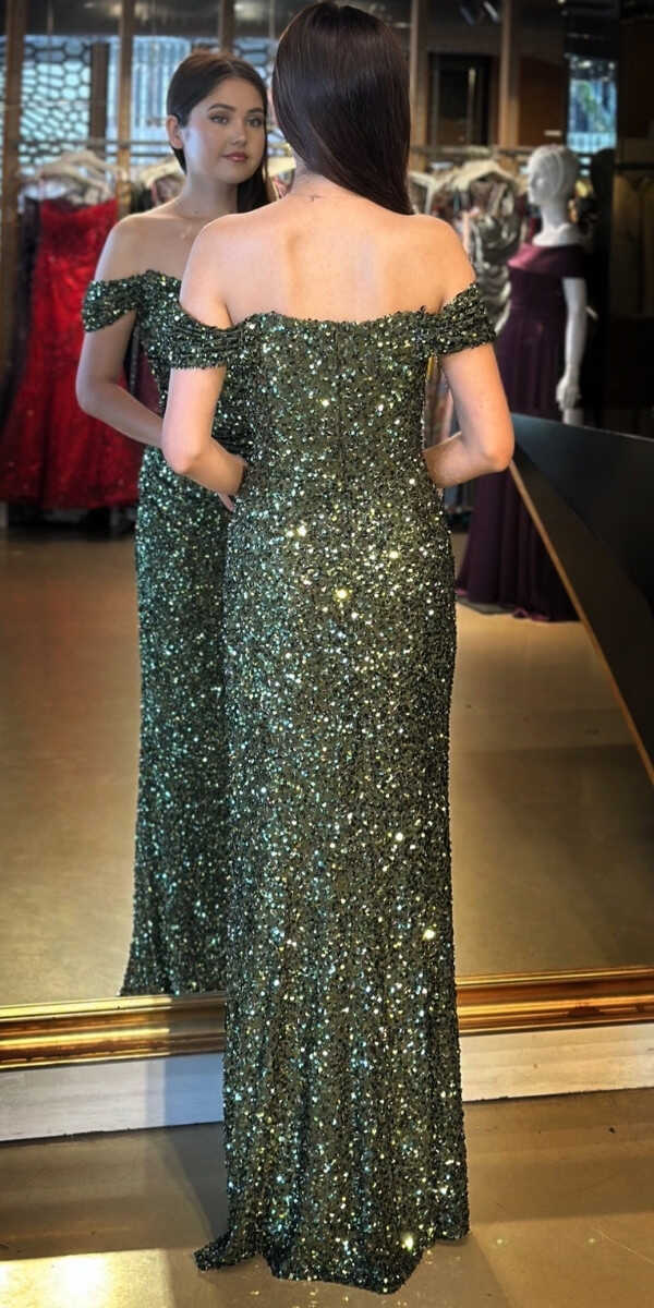 Olive Renk Düz Kesim Uzun Abiye Elbise, Payet Kumaştan Üretilmiş olup Pırıltısıyla Göz Kamaştıracaktır.