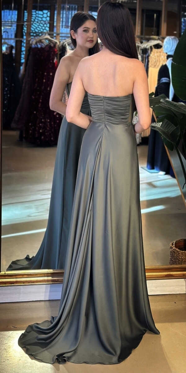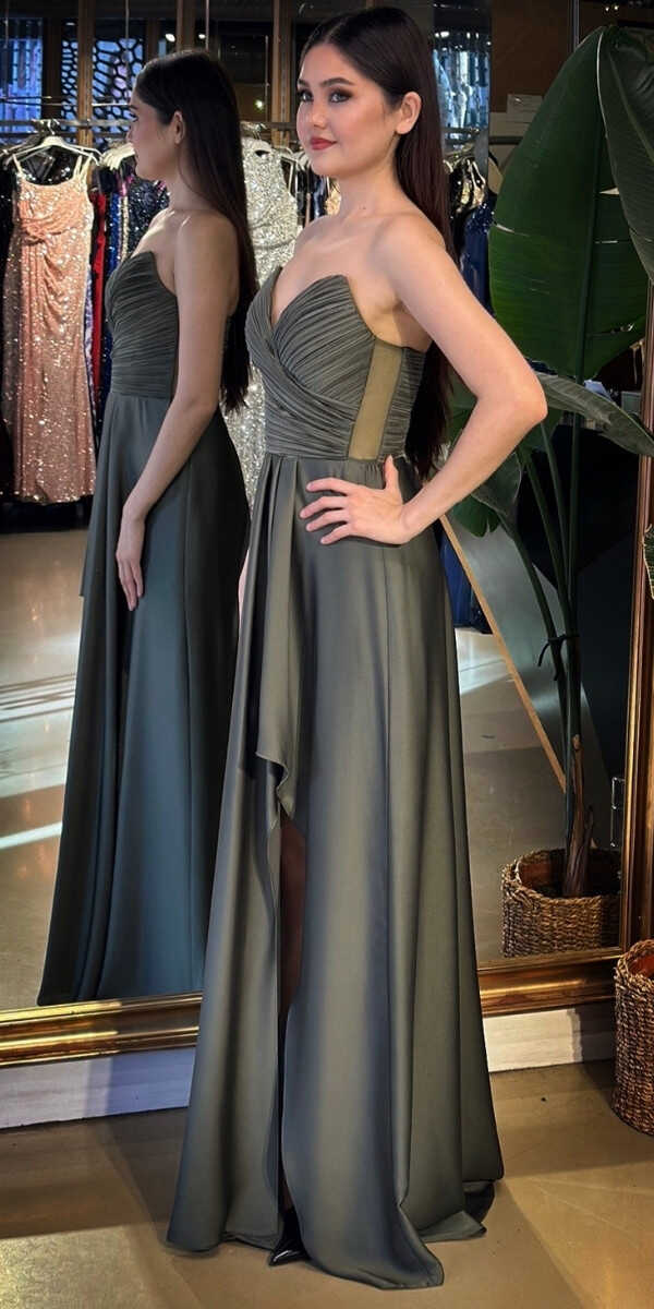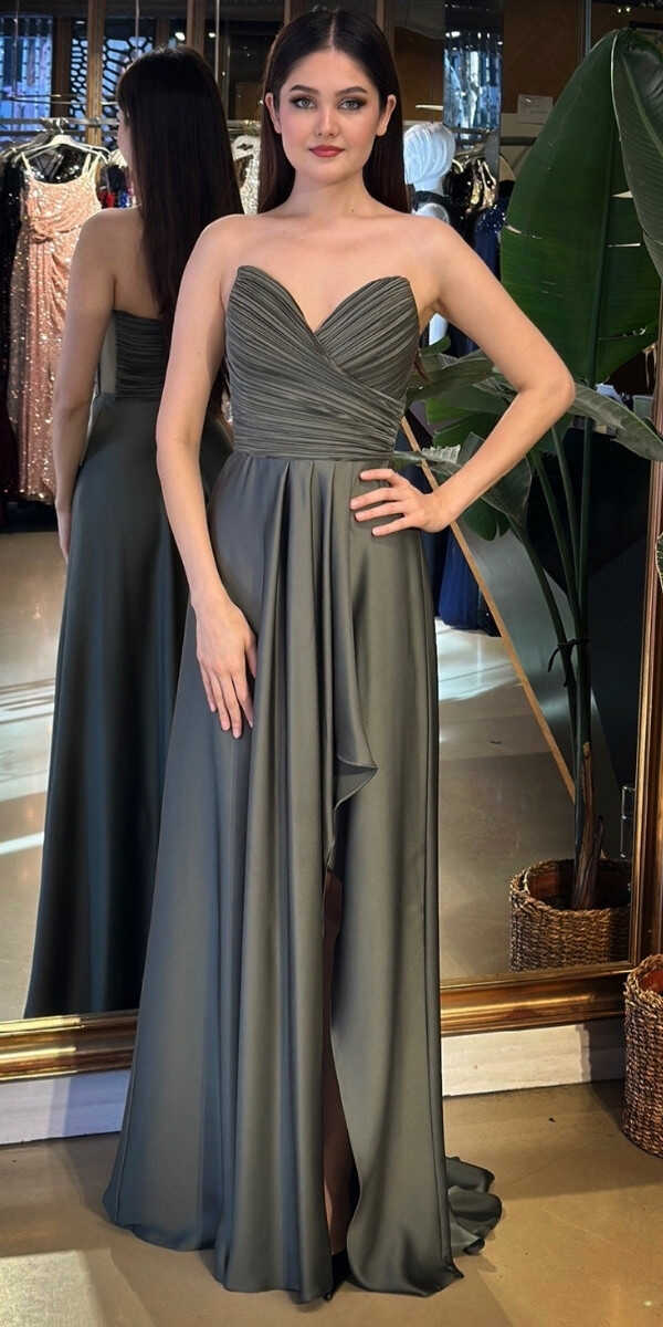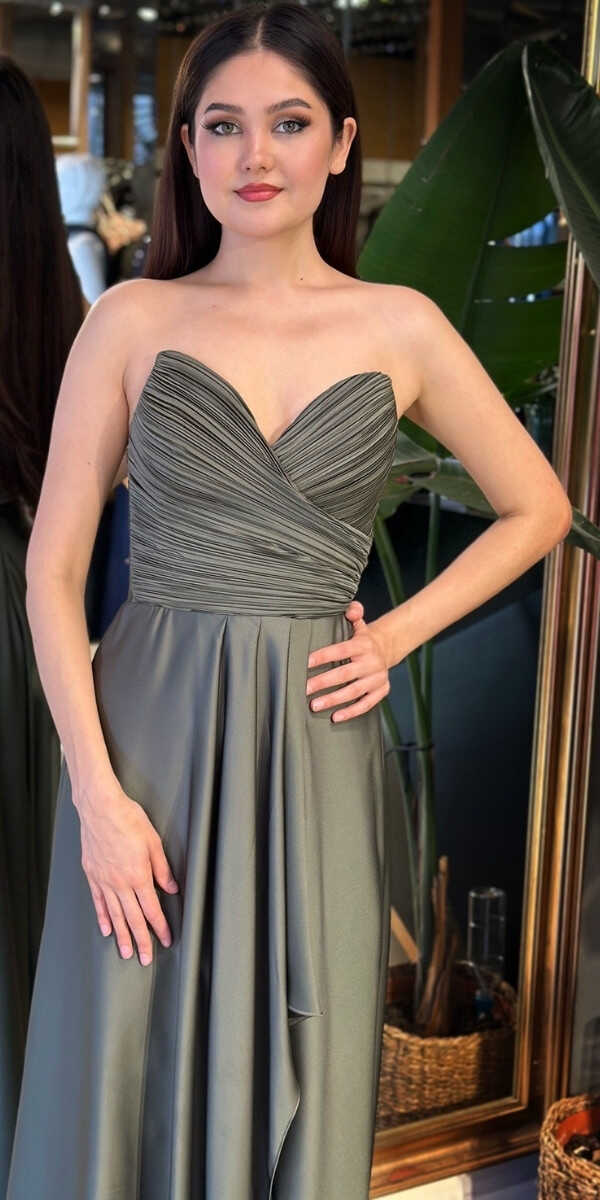 Straplez Yaka Olive Renk Kloş Etekli Uzun Abiye Elbise, Saten Kumaştan Üretilmiş olup Satenin Pürüzsüz Işığı Görünümünüze Zarafet Katacaktır. Adeta Göz Kamaştıran Bir Görünüm Yaratacak.