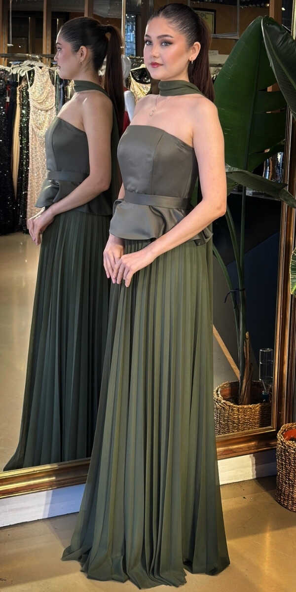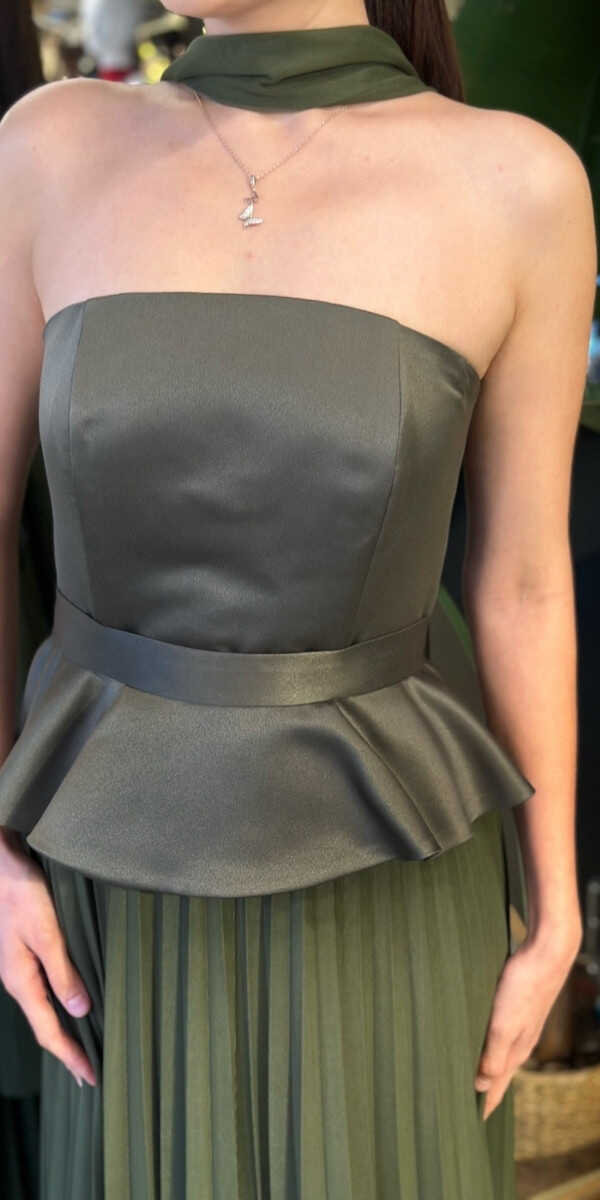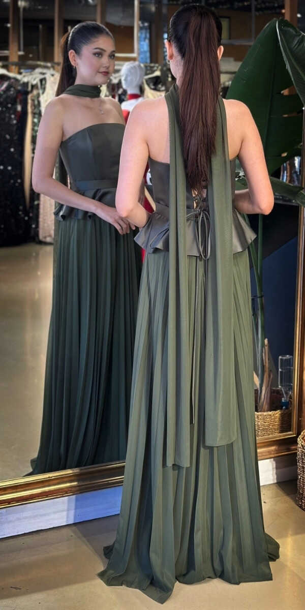 Straplez Yaka Olive Renk Kloş Etekli Uzun Abiye Elbise, Şifon Kumaştan Üretilmiş olup Uçuş Uçuş Şifon Kumaş Tüm Dikkatleri Üzerinize Toplayacaktır. Şık Sırt Dekoltesi Size Çok Yakışacak.