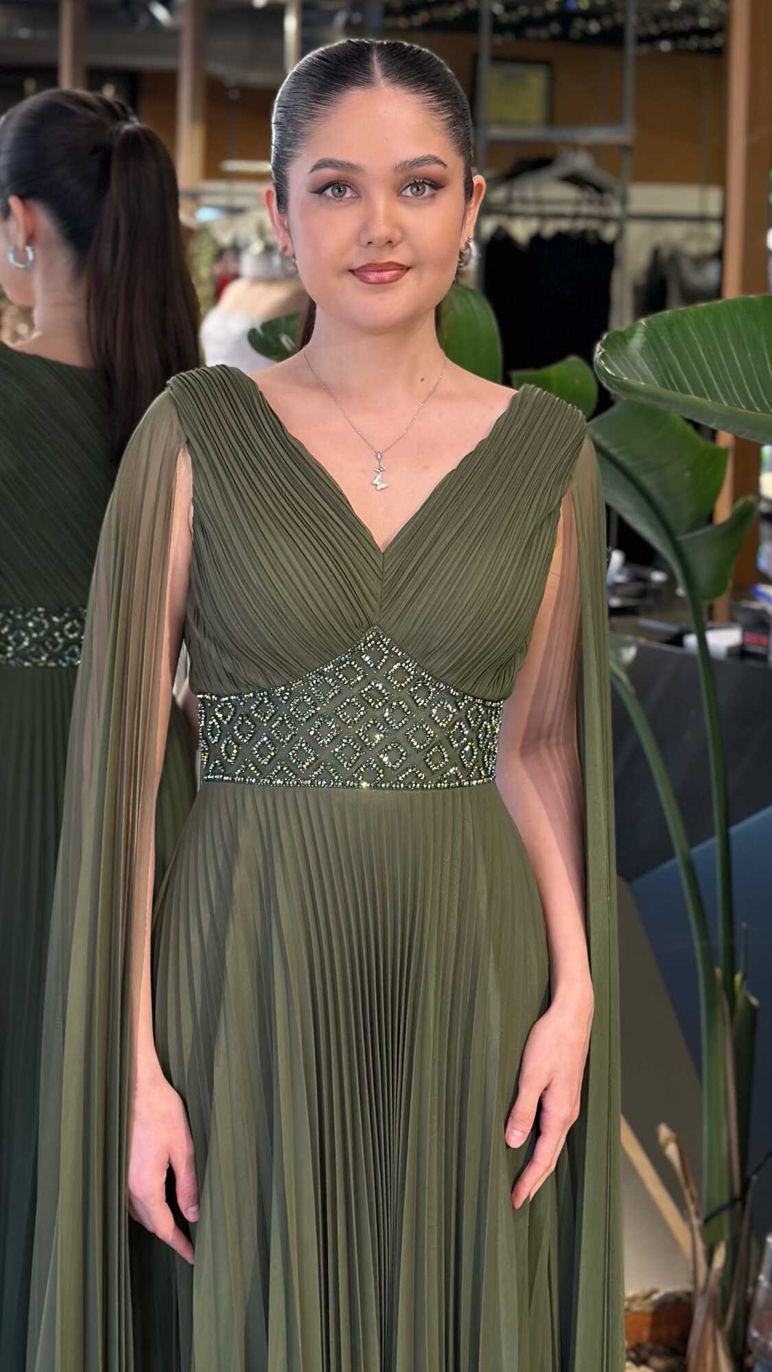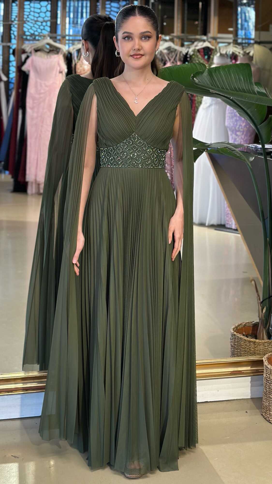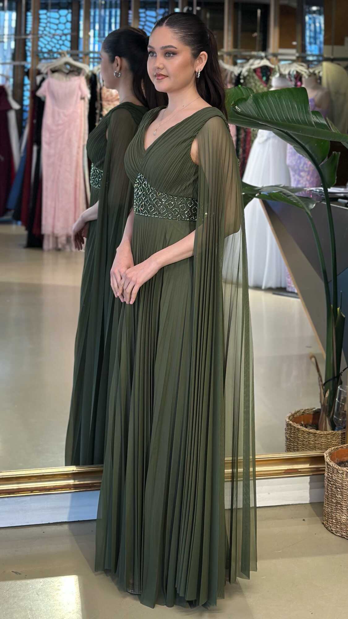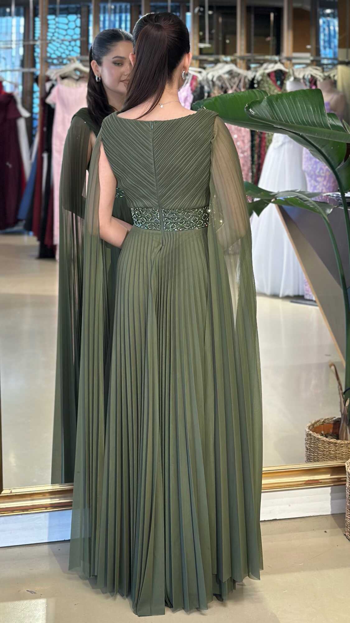 V Yaka Olive Renk Kloş Etekli Uzun Abiye Elbise, Şifon Kumaştan Üretilmiş olup Uçuş Uçuş Şifon Kumaş Tüm Dikkatleri Üzerinize Toplayacaktır. Çıkarılabilir peleriniyle iki farklı kullanım imkânı sunar.