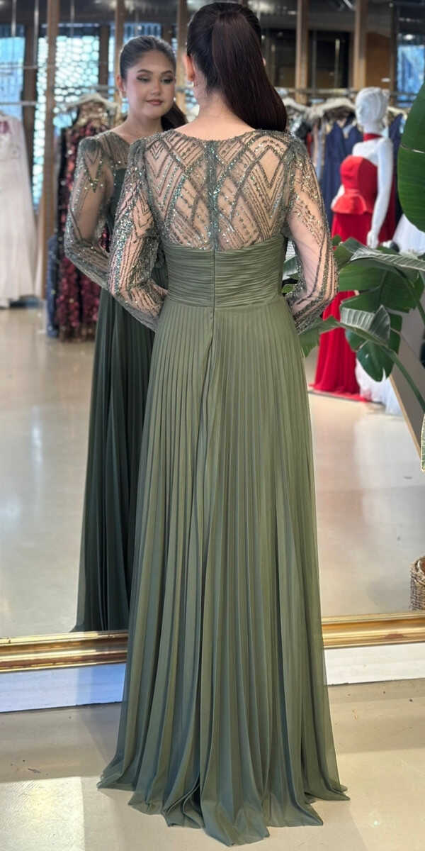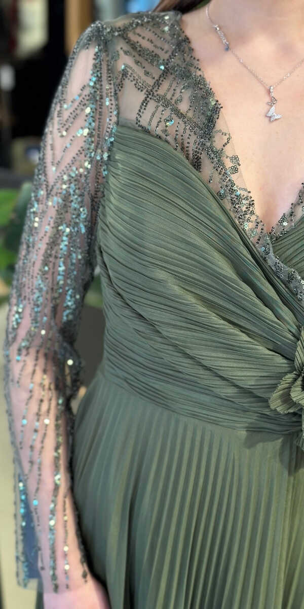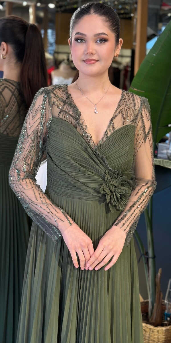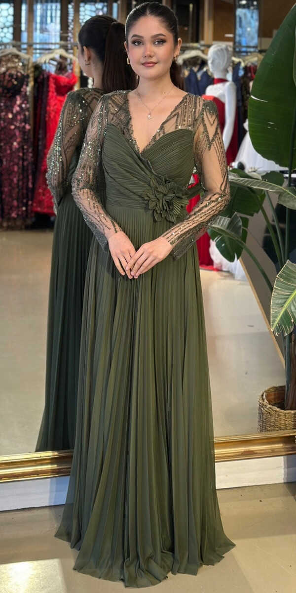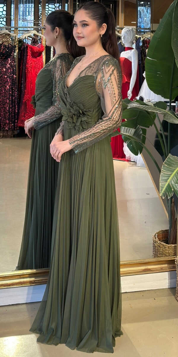 Gelince Haber VerV Yaka Olive Renk Kloş Etekli Uzun Abiye Elbise, Şifon Kumaştan Üretilmiş olup Uçuş Uçuş Şifon Kumaş Tüm Dikkatleri Üzerinize Toplayacaktır. Uzun kollarıyla, kollarınızı zarif bir şekilde kapatır. Çiçek Detayı Modern Bir Görünüm Yaratacaktır.