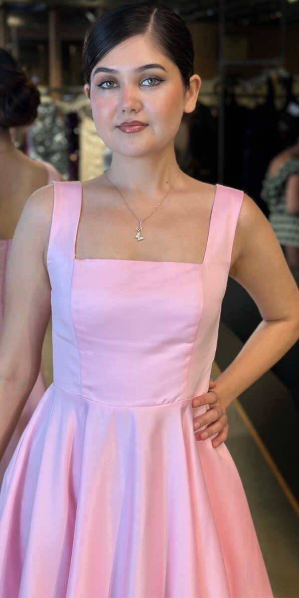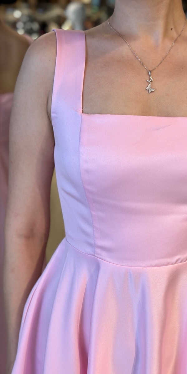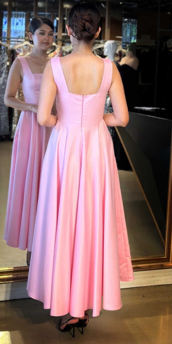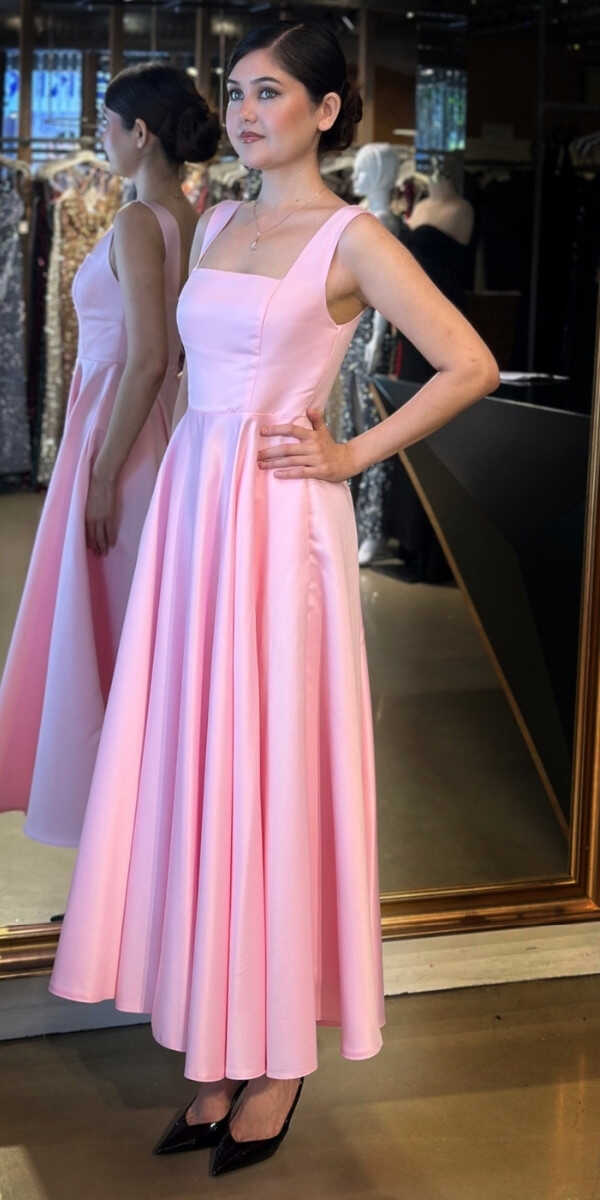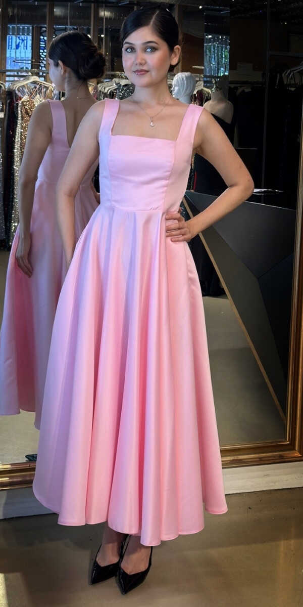 Pembe Renk Kloş Etekli Midi Abiye Elbise, Saten Kumaştan Üretilmiş olup Satenin Pürüzsüz Işığı Görünümünüze Zarafet Katacaktır.