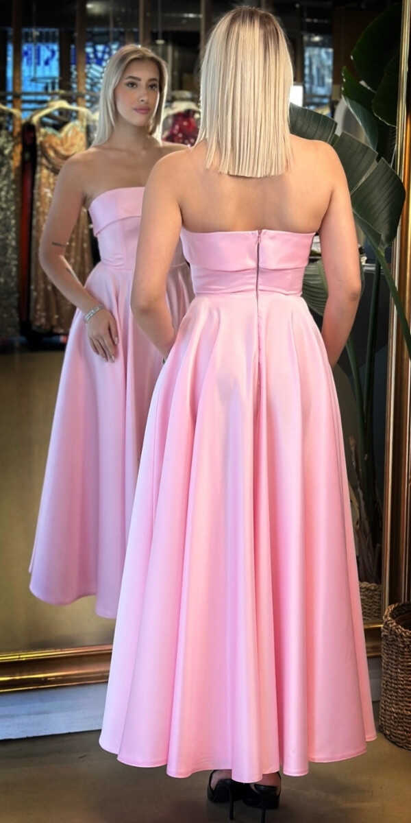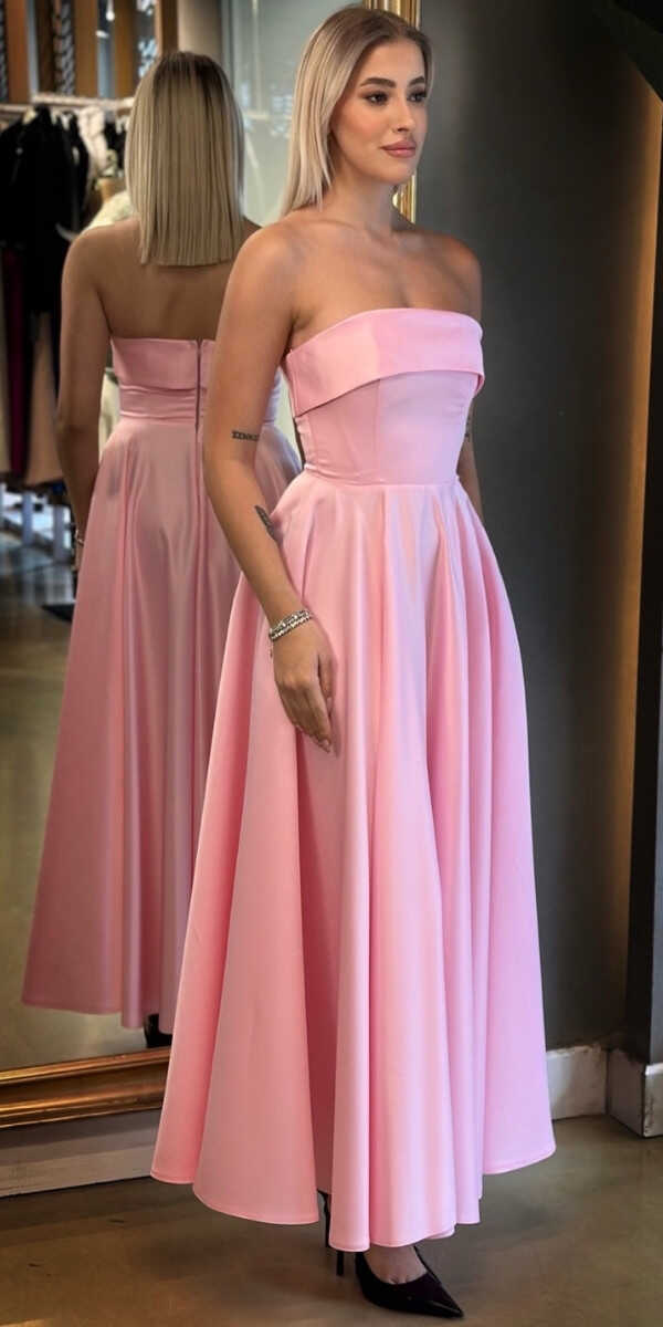 Pembe Renk Kloş Etekli Midi Abiye Elbise, Saten Kumaştan Üretilmiş Olup Satenin Pürüzsüz Işığı Görünümünüze Zarafet Katacaktır.