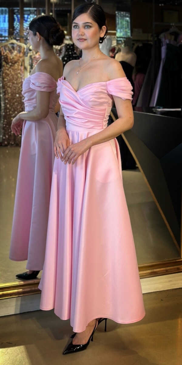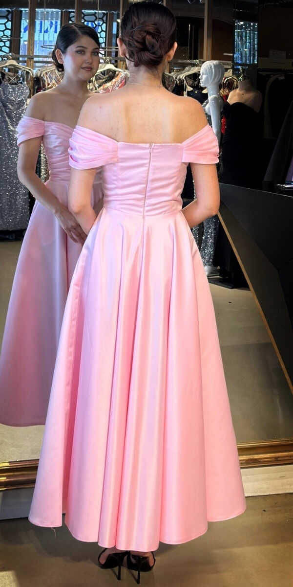 Pembe Renk Kloş Etekli Midi Abiye Elbise, Saten Kumaştan Üretilmiş olup Satenin Pürüzsüz Işığı Görünümünüze Zarafet Katacaktır.