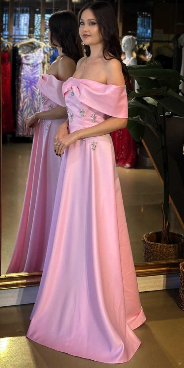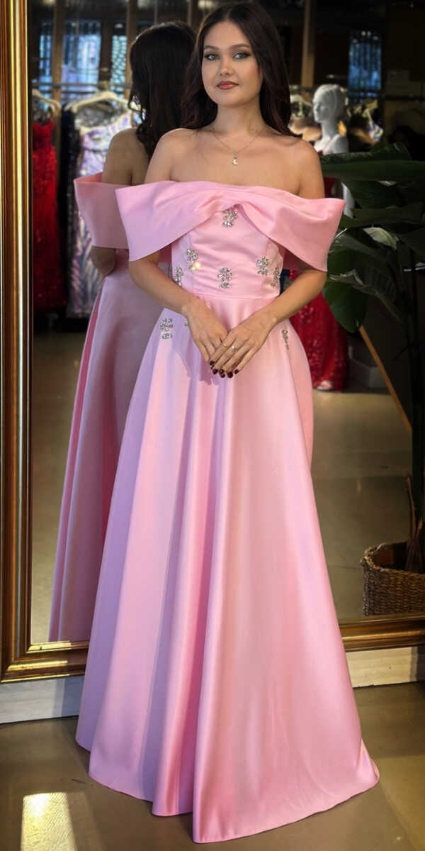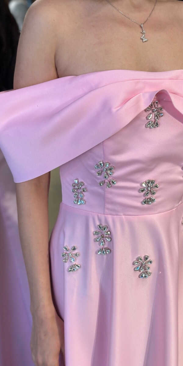 Madonna Yaka Pembe Renk Kloş Etekli Uzun Abiye Elbise, Saten Kumaştan Üretilmiş olup Satenin Pürüzsüz Işığı Görünümünüze Zarafet Katacaktır. Taşlı Aksesuar Dikkatleri Üzerinizde Toplayacak.