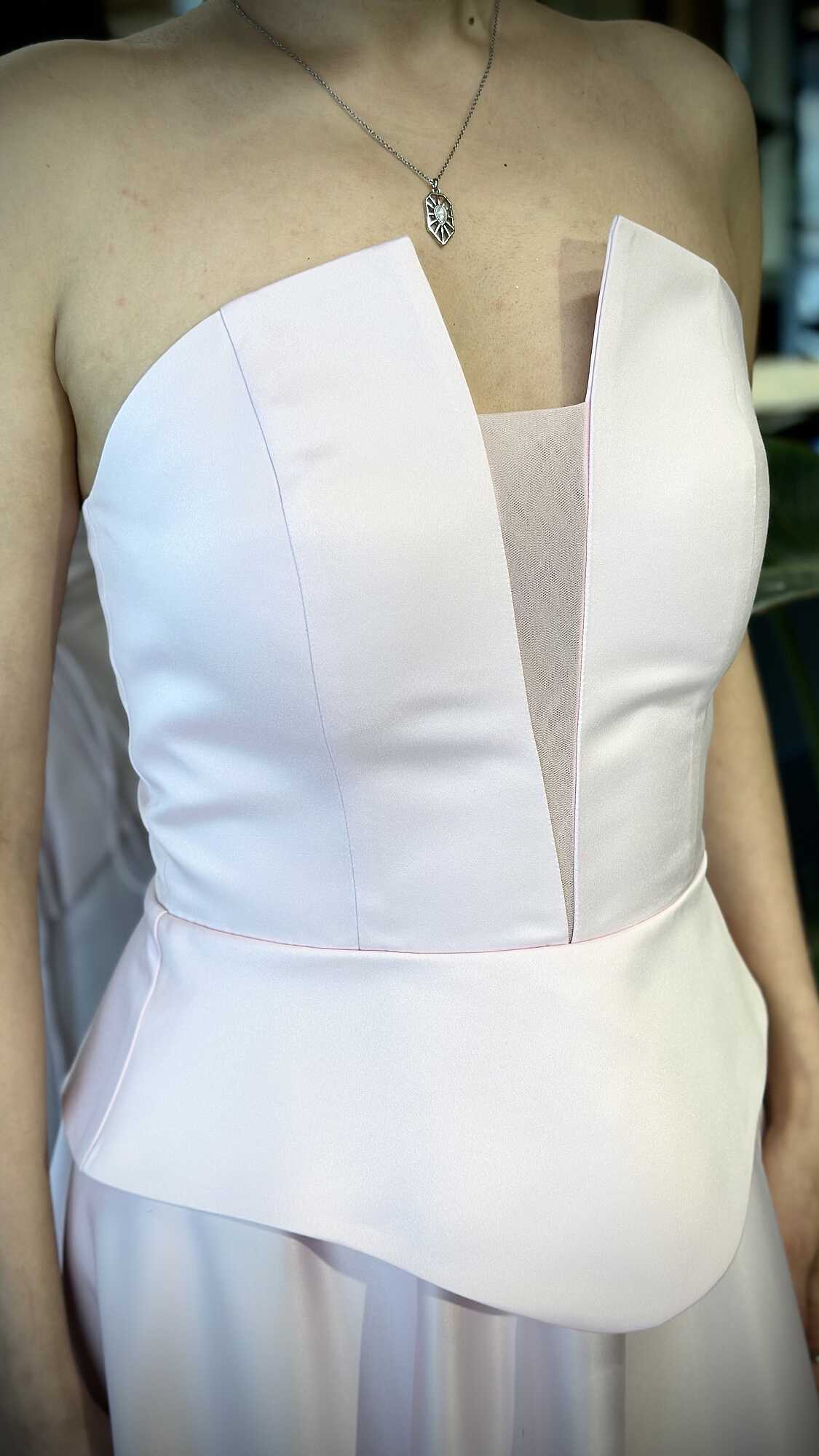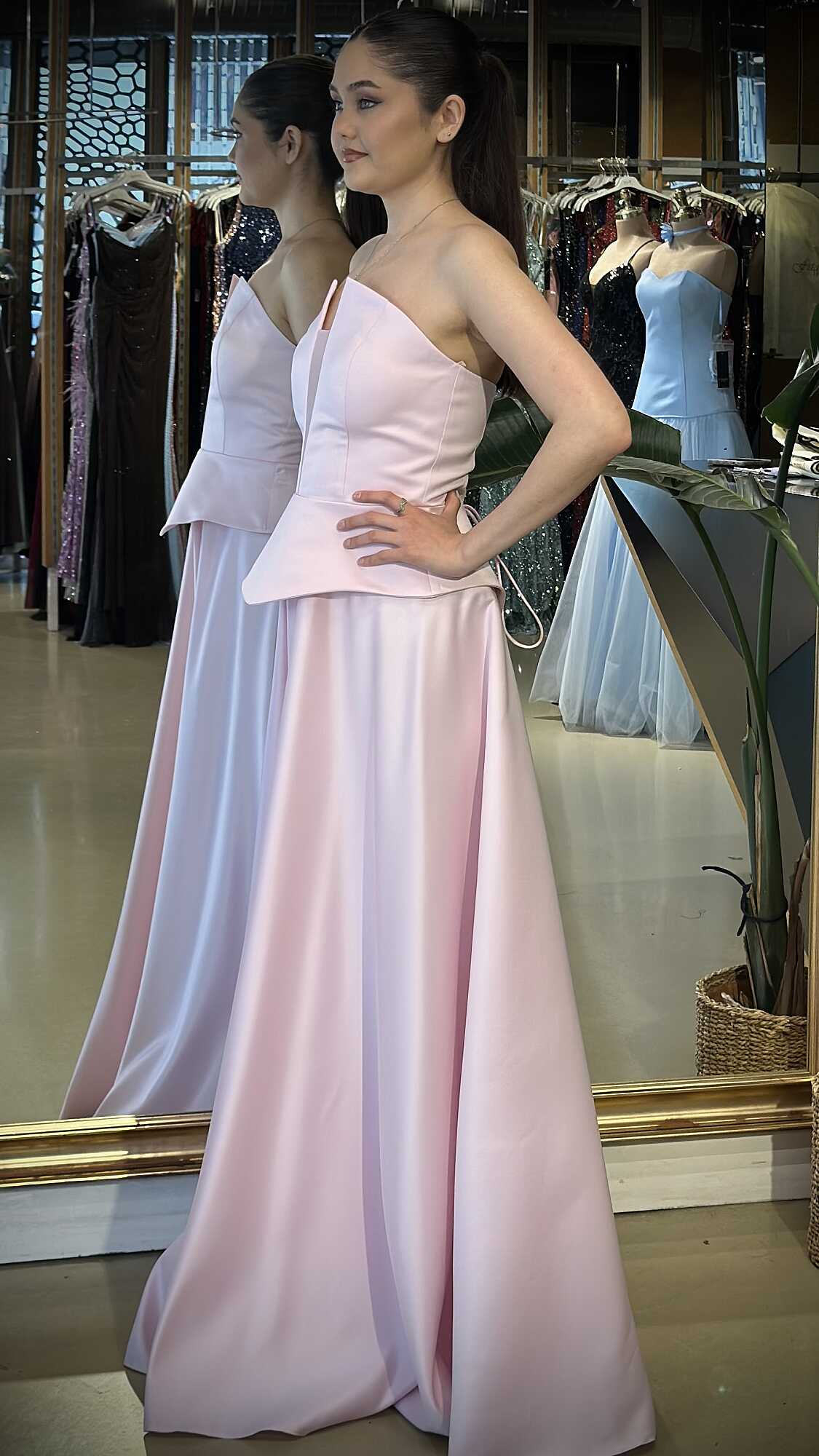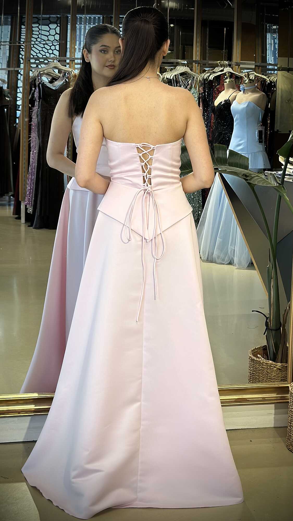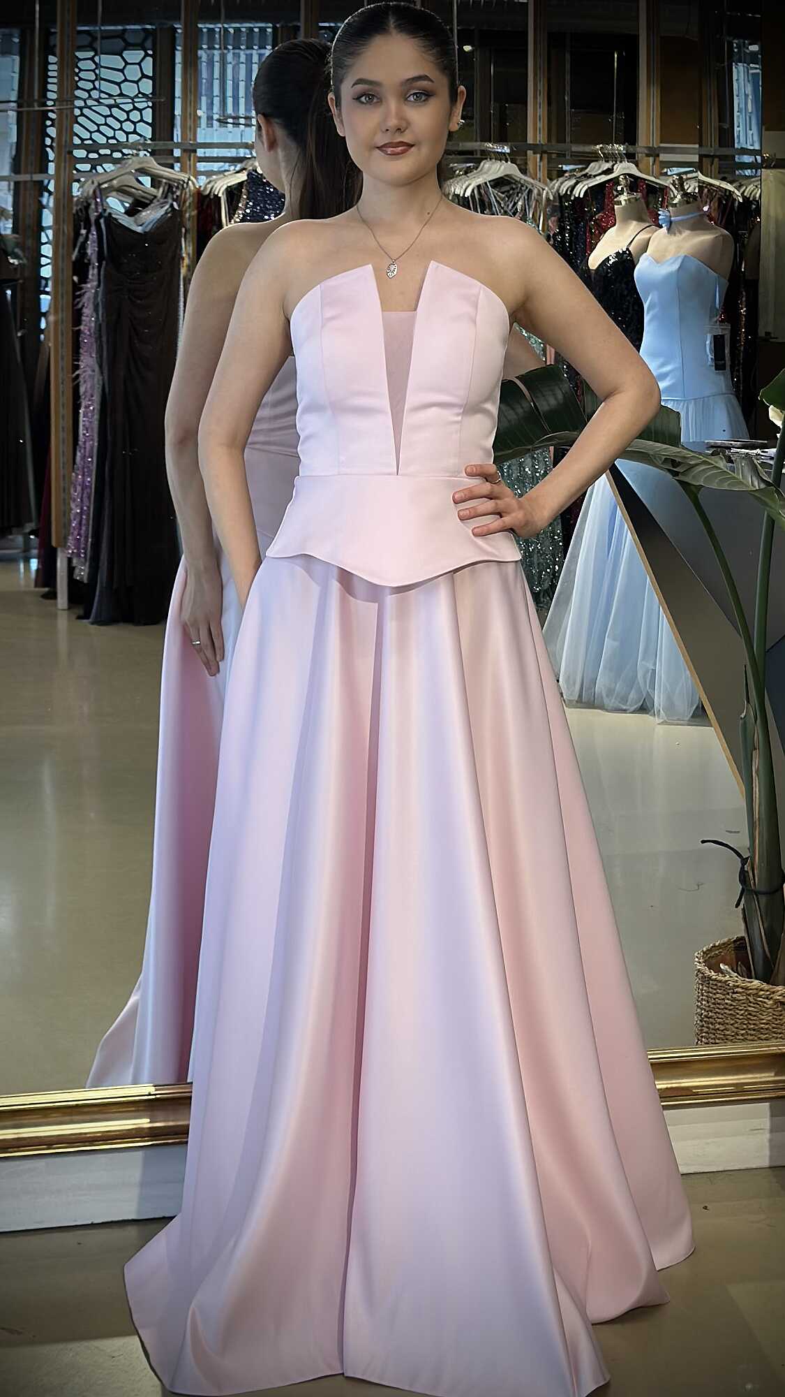 Straplez Yaka Pembe Renk Kloş Etekli Uzun Abiye Elbise, Saten Kumaştan Üretilmiş olup Satenin Pürüzsüz Işığı Görünümünüze Zarafet Katacaktır. Zarif göğüs dekoltesiyle dengeli bir çekicilik oluşturur.