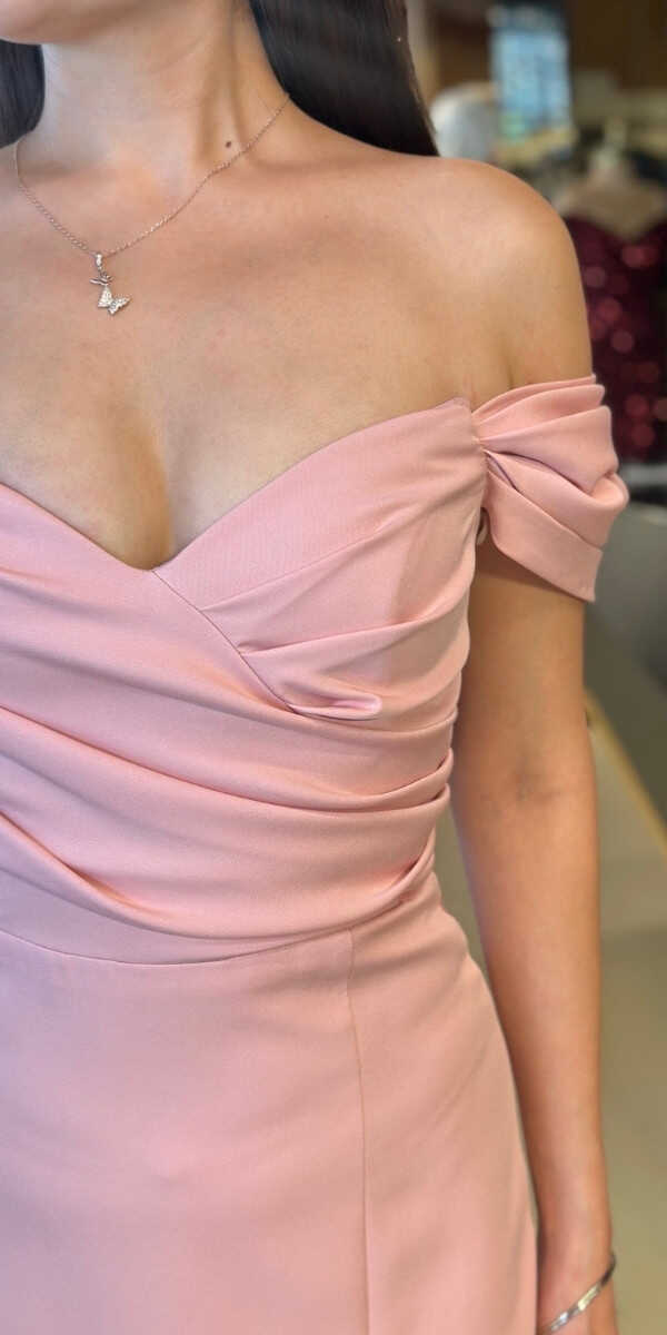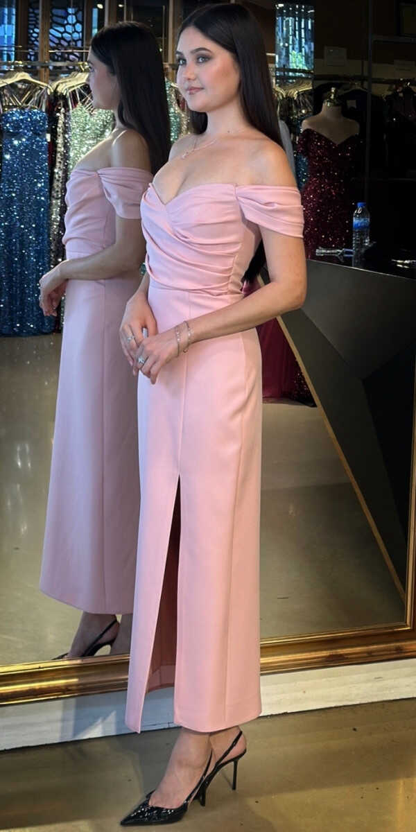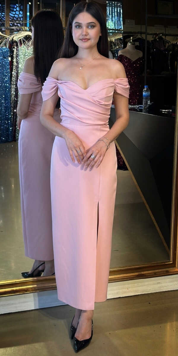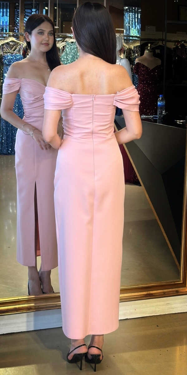 Pudra Renk Renk Düz Kesim Midi Abiye Elbise, Krep Kumaştan Üretilmiş olup Hafif Ve Daha Az Kırışan Krep Kumaş Sizi Daha Rahat Hissettirecektir. Yırtmaç Detayı Cesur ve Çarpıcı Bir Stil Sunacaktır.