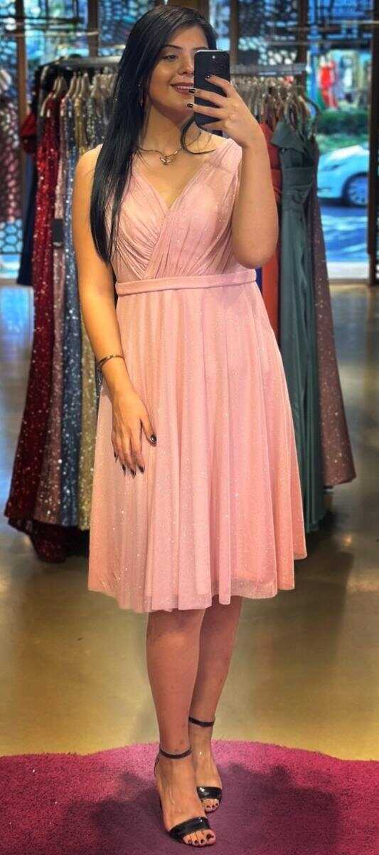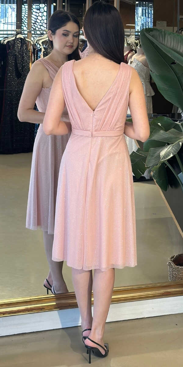 Pudra Renk Kloş Etekli Kısa Abiye Elbise, Simli Kumaştan Üretilmiş Olup Simlerin Işıltısıyla Çok Hoş Gözükeceksiniz