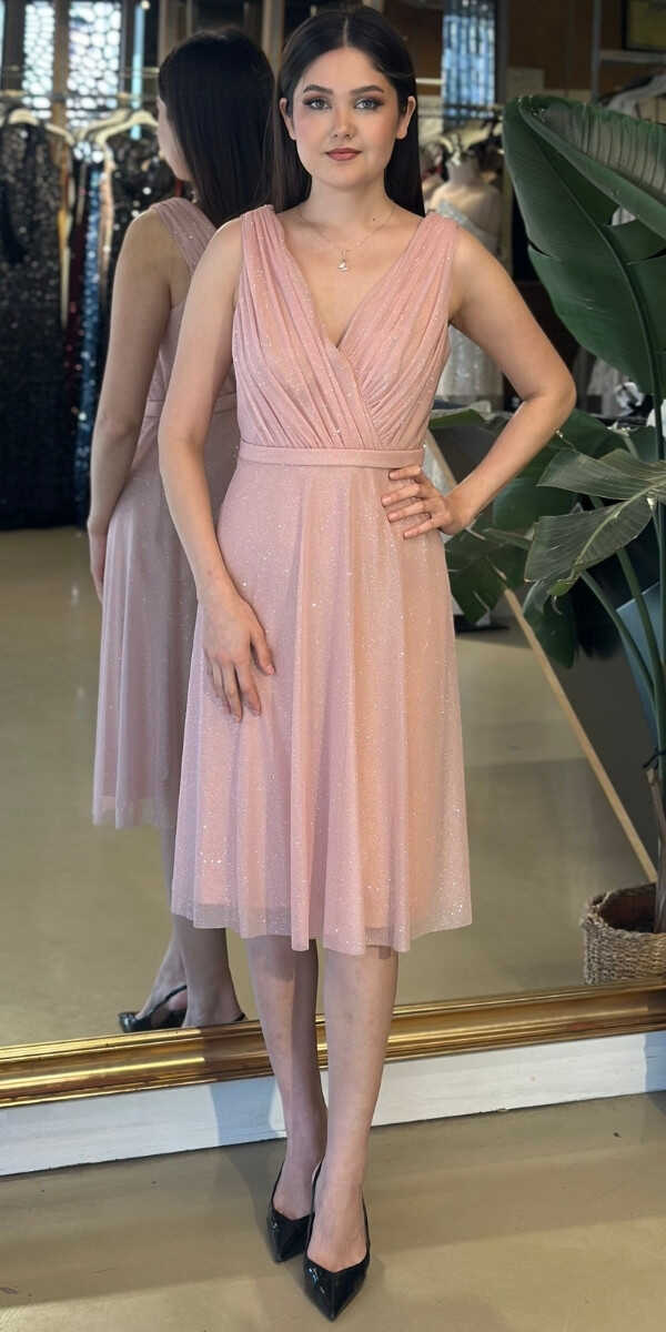 Pudra Renk Kalın Askı Kloş Etekli Simli Kısa Abiye Elbise 7119