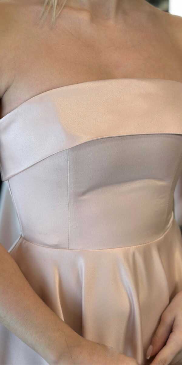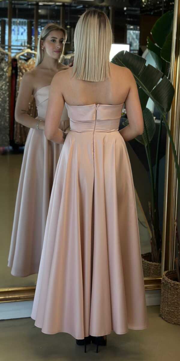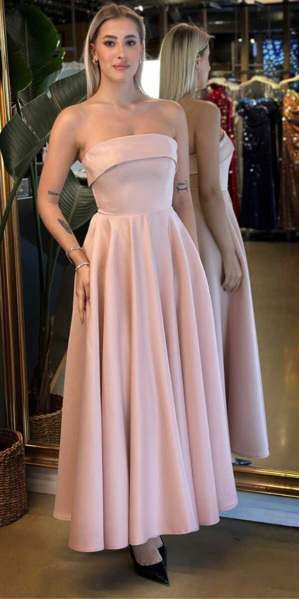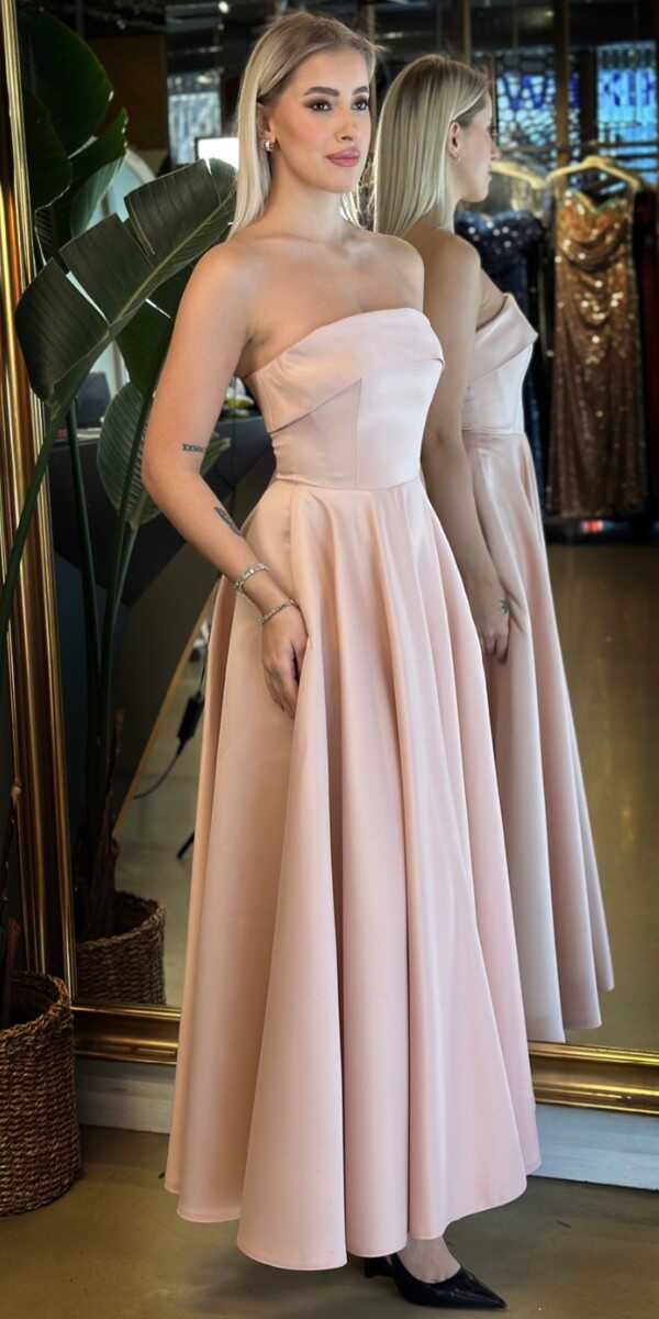 Pudra Renk Kloş Etekli Midi Abiye Elbise, Saten Kumaştan Üretilmiş Olup Satenin Pürüzsüz Işığı Görünümünüze Zarafet Katacaktır.