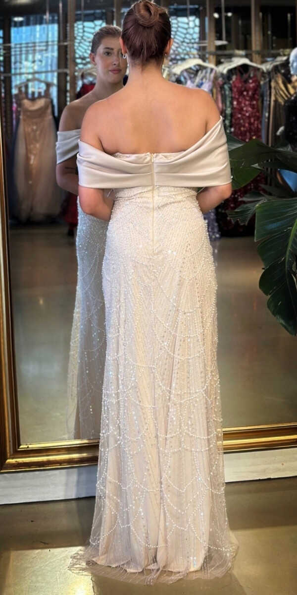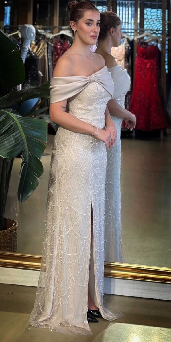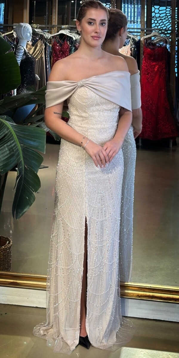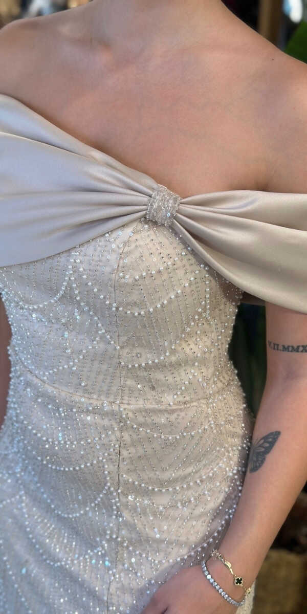 Madonna Yaka Pudra Renk Renk Düz Kesim Uzun Abiye Elbise, Pullu Boncuklu Kumaştan Üretilmiş olup Parıltı ve Zarafetin Buluştuğu Kumaş Türü Sizi Işıl Işıl Gösterecektir. Yırtmaç Detayı Cesur ve Çarpıcı Bir Stil Sunacaktır.