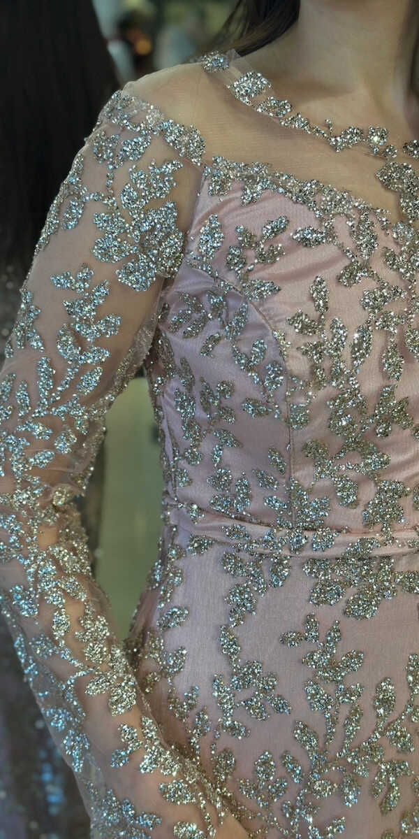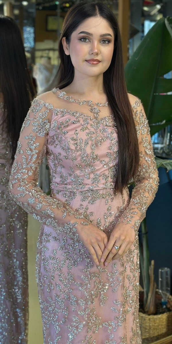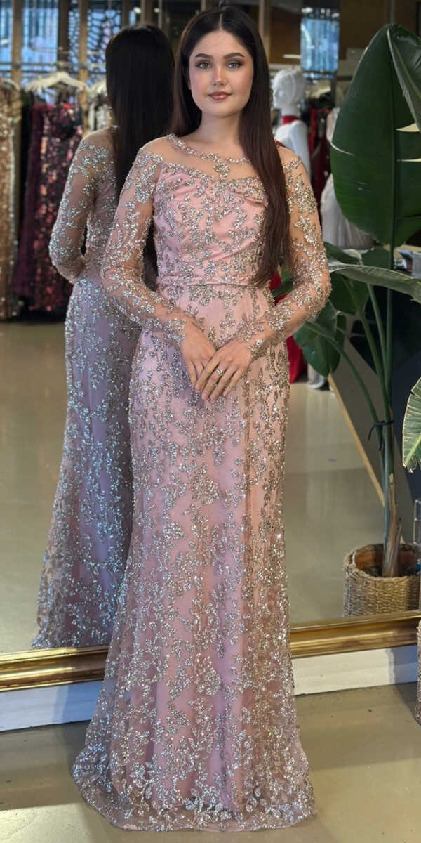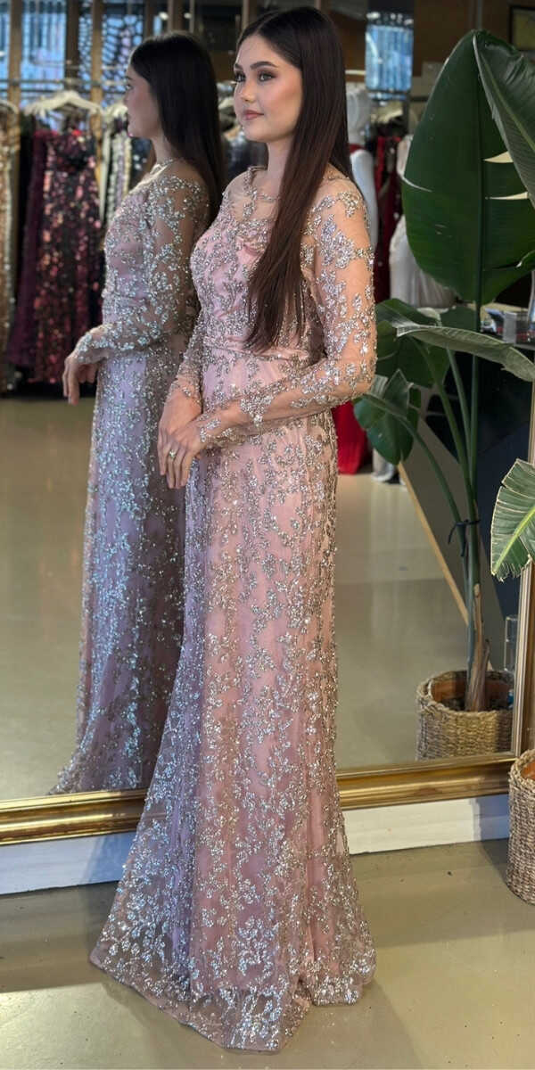 Yuvarlak Yaka Pudra Renk Renk Düz Kesim Uzun Abiye Elbise, Simli Kumaştan Üretilmiş olup Simlerin Işıltısıyla Çok Hoş Gözükeceksiniz. Uzun kollarıyla, kollarınızı zarif bir şekilde kapatır.