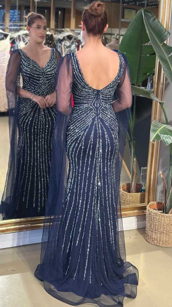 Saks Yırtmaçlı Düz Kesim Krep Uzun Abiye Elbise 7524