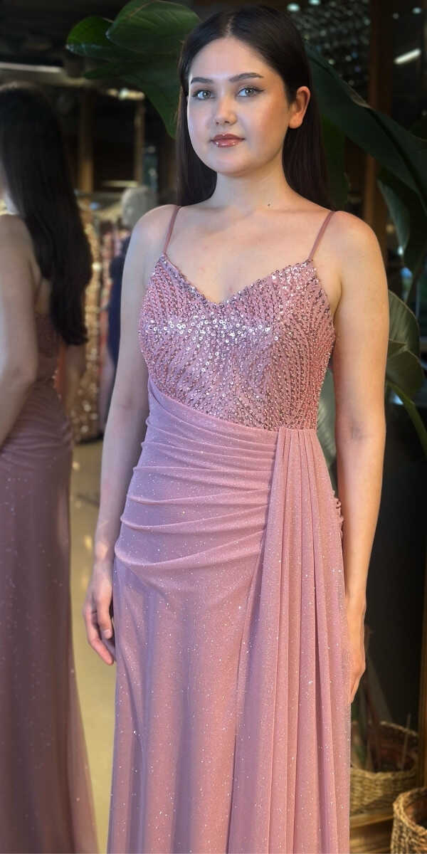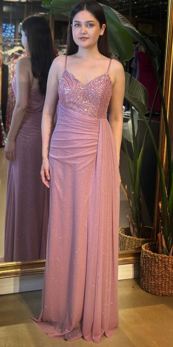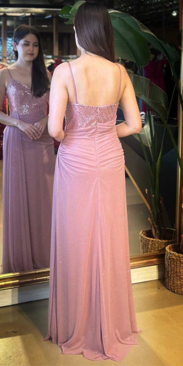 Rose Renk Düz Kesim Uzun Abiye Elbise, Simli Kumaştan Üretilmiş olup Simlerin Işıltısıyla Çok Hoş Gözükeceksiniz Elbisedeki İp Askılar Kullanım Kolaylığı Yaratacaktır.