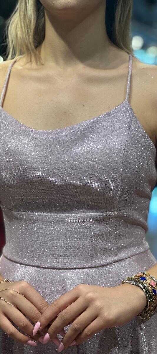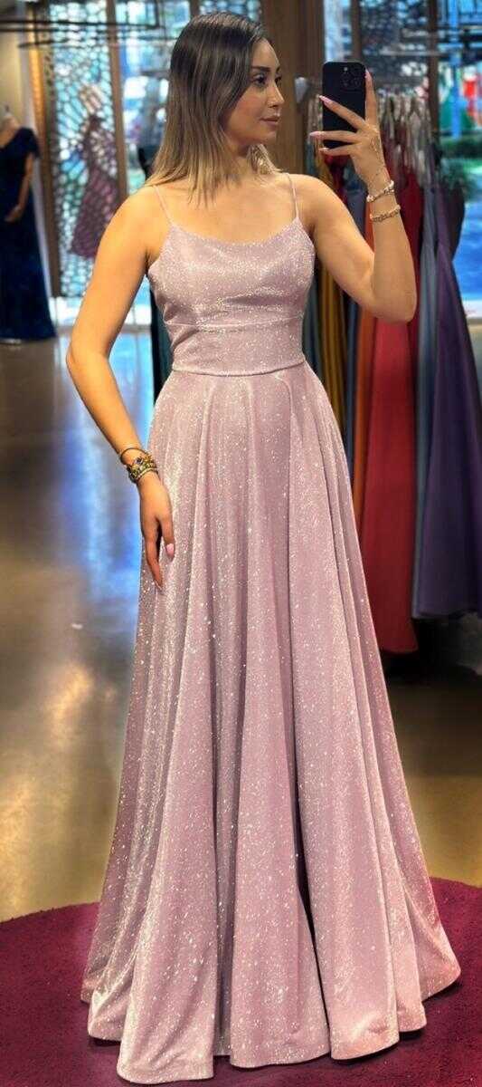 Rose Renk Kloş Etekli Uzun Abiye Elbise, Simli Kumaştan Üretilmiş Olup Simlerin Işıltısıyla Çok Hoş Gözükeceksiniz Elbisedeki İp Askılar Kullanım Kolaylığı Yaratacaktır. Şık Sırt Dekoltesi Size Çok Yakışacak.