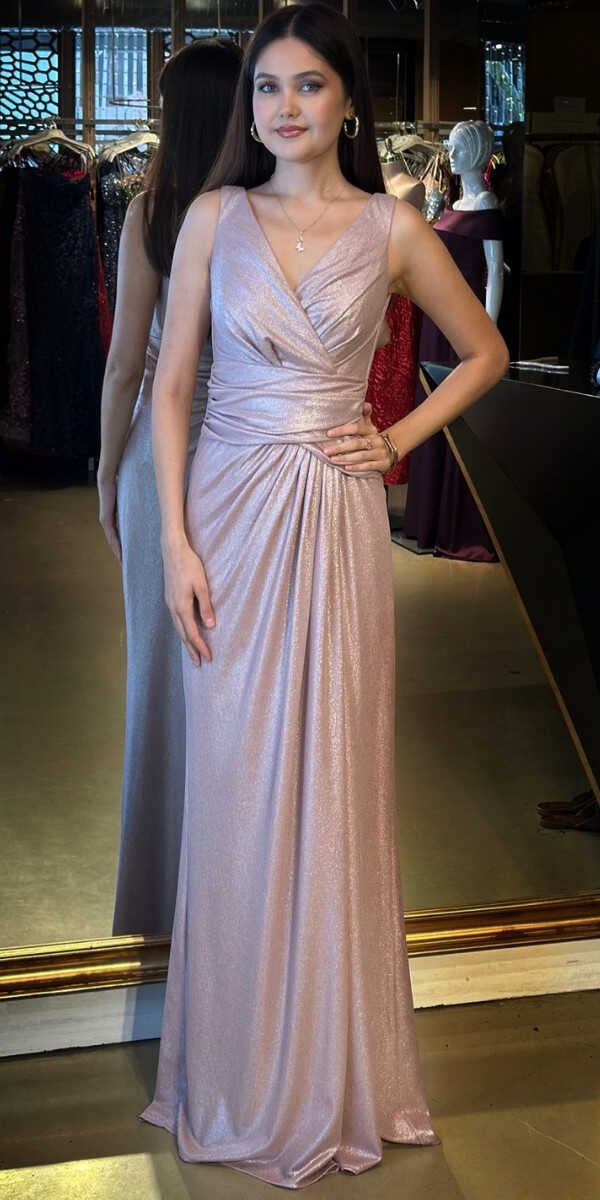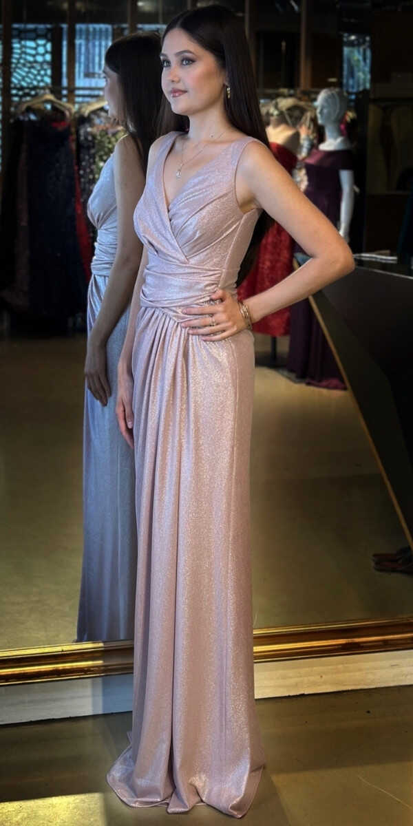 Rose Renk Düz Kesim Uzun Abiye Elbise, Simli Kumaştan Üretilmiş olup Simlerin Işıltısıyla Çok Hoş Gözükeceksiniz Adeta Göz Kamaştıran Bir Görünüm Yaratacak.