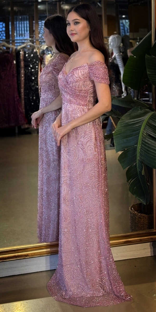Madonna Yaka Rose Renk Düz Kesim Uzun Abiye Elbise, Simli Kumaştan Üretilmiş olup Simlerin Işıltısıyla Çok Hoş Gözükeceksiniz. Şık Sırt Dekoltesi Size Çok Yakışacak.