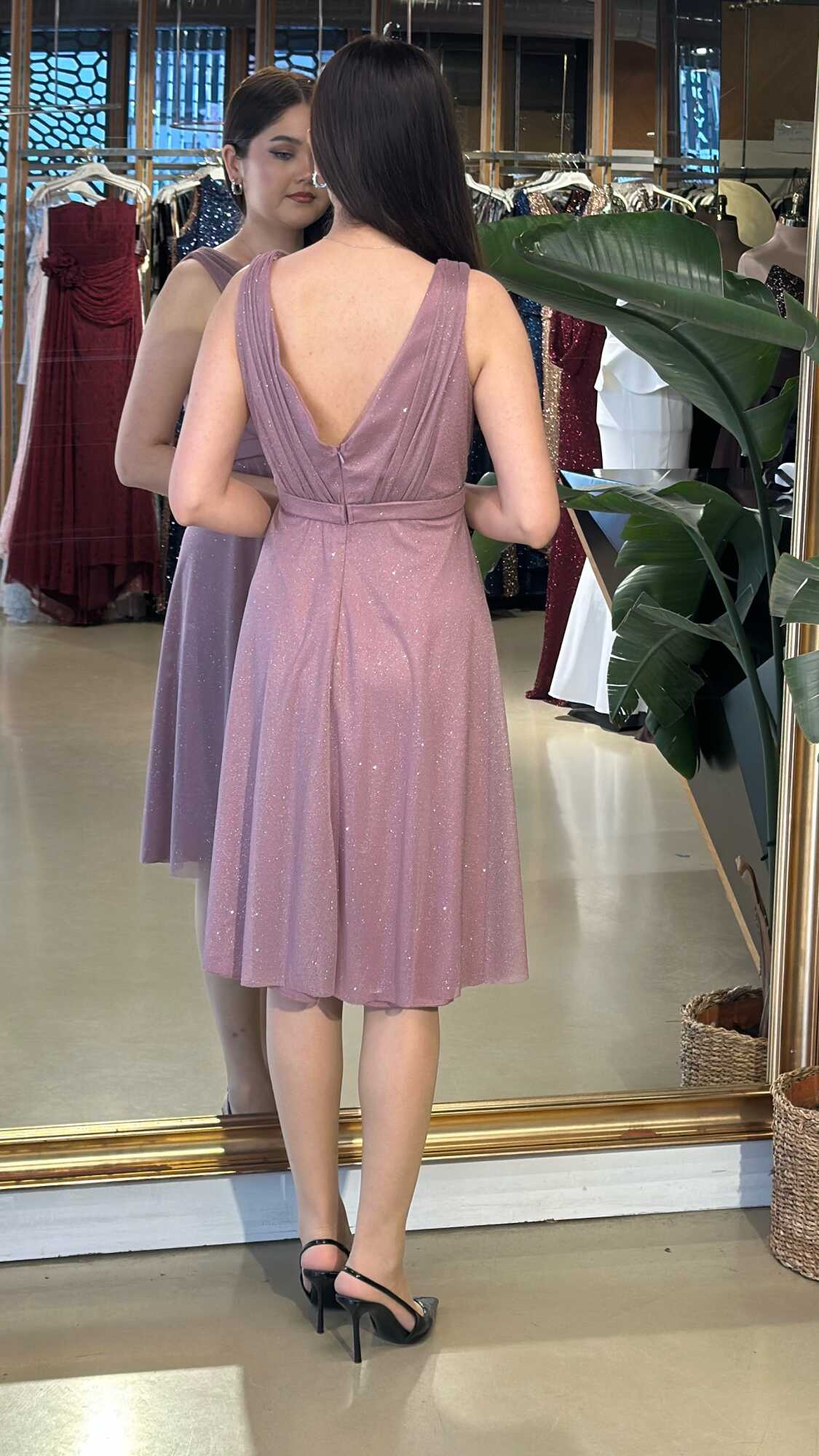 Rose Renk Kalın Askı Kloş Etekli Simli Kısa Abiye Elbise 7119