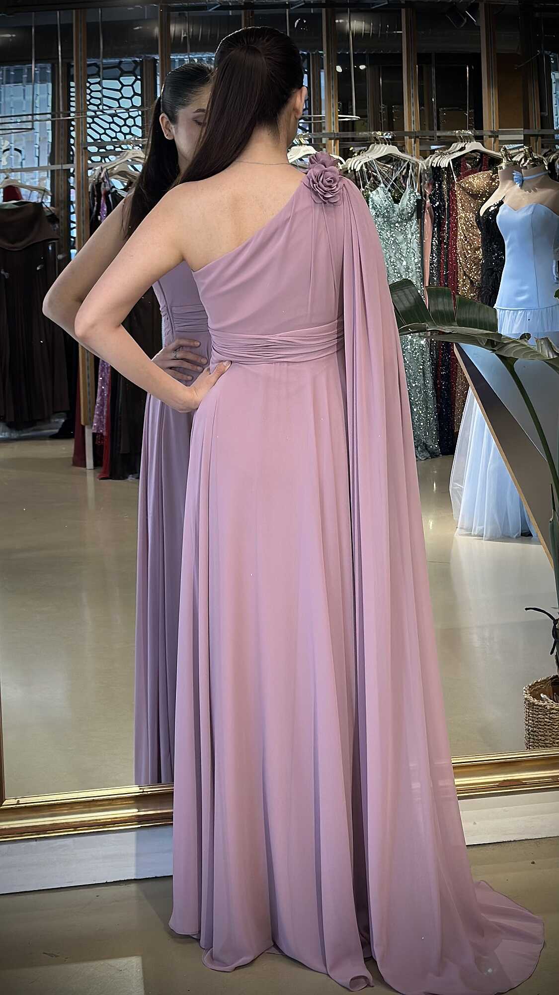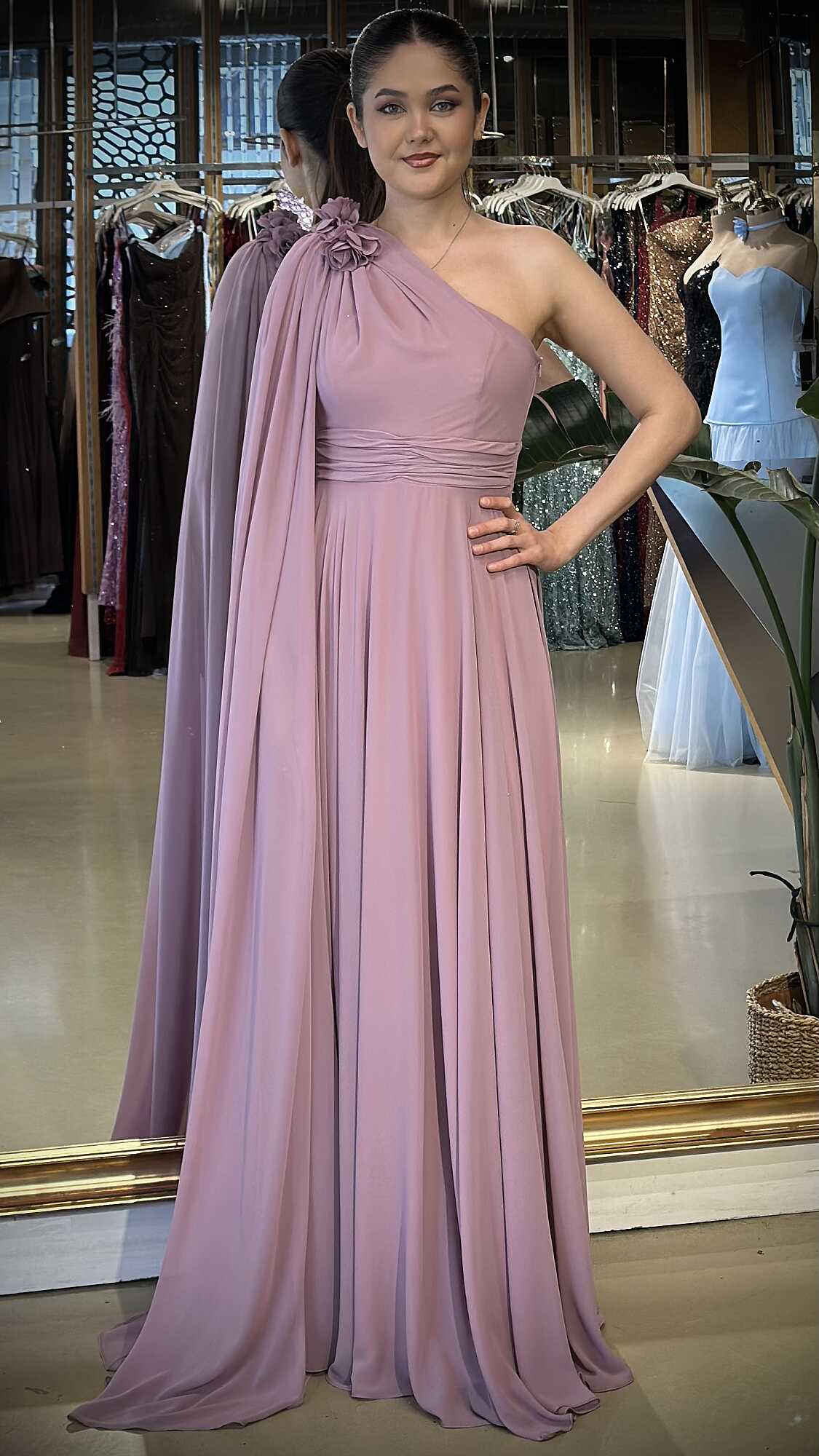 Rose Tek Omuzlu Çiçek Detaylı Kloş Etekli Şifon Uzun Abiye Elbise 7401