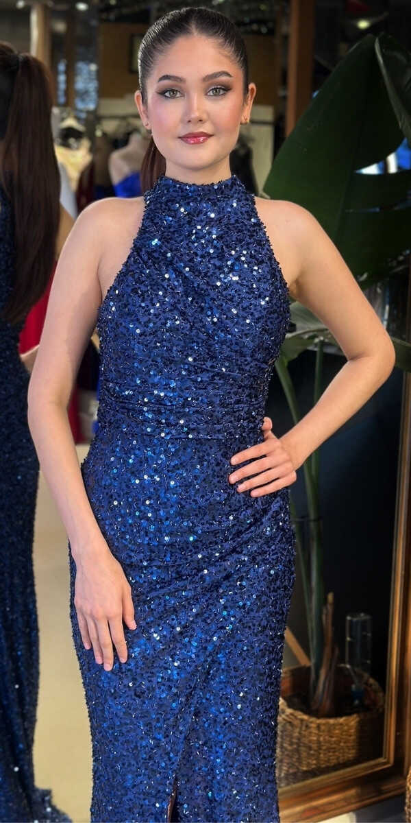 Gelince Haber VerHalter Yaka Saks Renk Düz Kesim Uzun Abiye Elbise, Payet Kumaştan Üretilmiş olup Pırıltısıyla Göz Kamaştıracaktır. Vücuda uyum sağlayan likralı kumaş, dinamik bir duruş kazandırır. Yırtmaç Detayı Cesur ve Çarpıcı Bir Stil Sunacaktır.