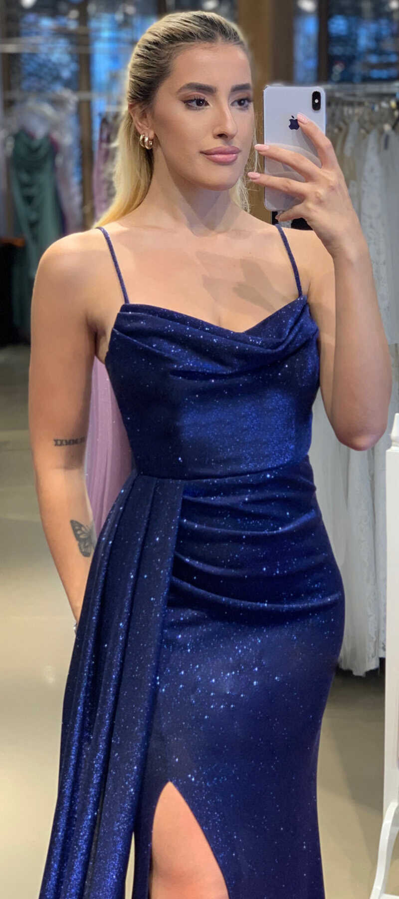 Saks Renk Düz Kesim Uzun Abiye Elbise, Simli Kumaştan Üretilmiş Olup Simlerin Işıltısıyla Çok Hoş Gözükeceksiniz Elbisedeki İp Askılar Kullanım Kolaylığı Yaratacaktır. Şık Sırt Dekoltesi Size Çok Yakışacak. Yırtmaç Detayı Cesur ve Çarpıcı Bir Stil Sunacaktır.
