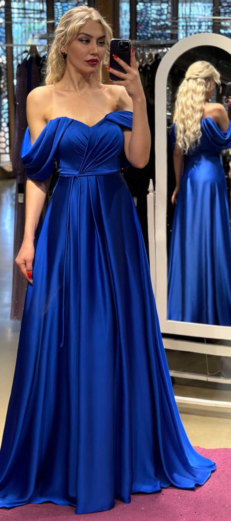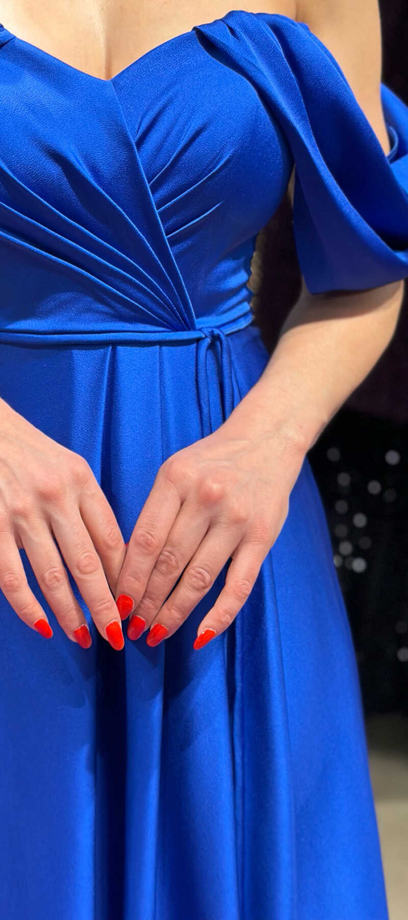 Saks Renk Kloş Etekli Uzun Abiye Elbise, Saten Kumaştan Üretilmiş Olduğundan Satenin Pürüzsüz Işığı Görünümünüze Zarafet Katacaktır.