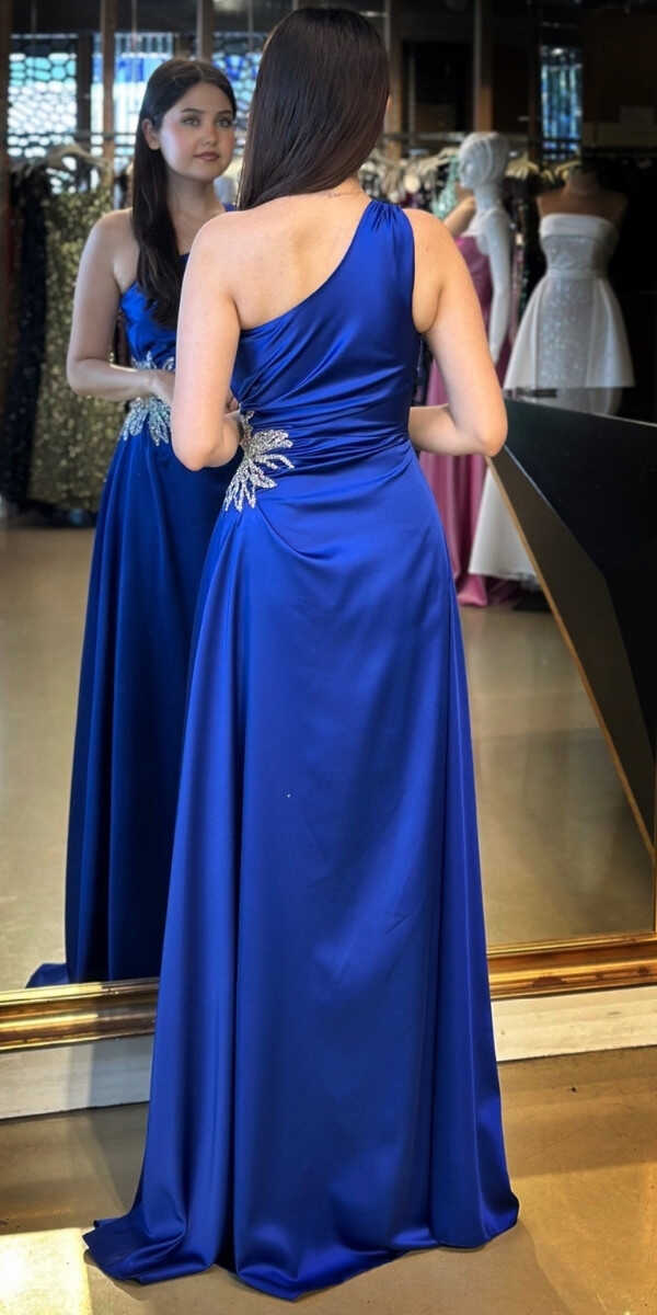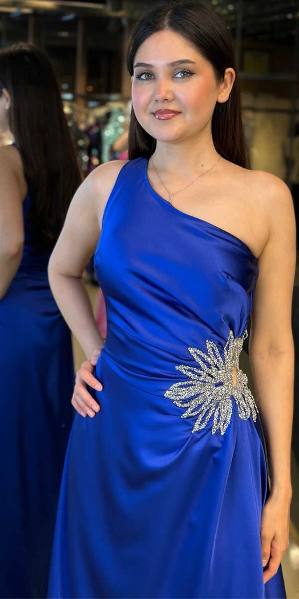 Saks Renk Düz Kesim Uzun Abiye Elbise, Saten Kumaştan Üretilmiş olup Satenin Pürüzsüz Işığı Görünümünüze Zarafet Katacaktır. Taşlı Aksesuar Dikkatleri Üzerinizde Toplayacak.