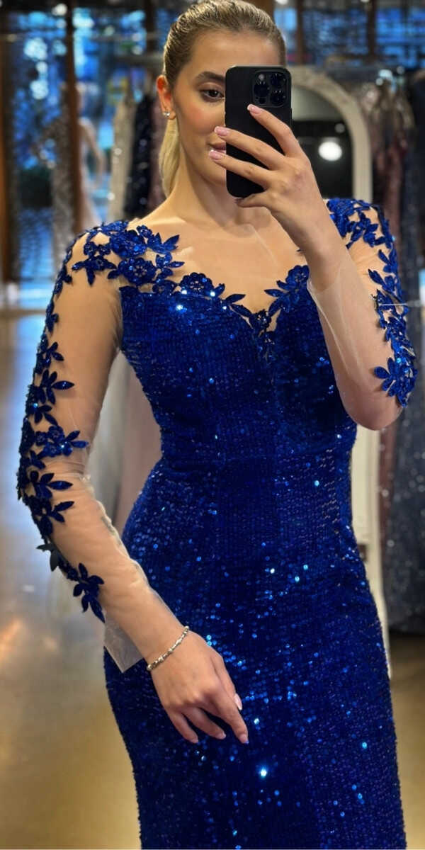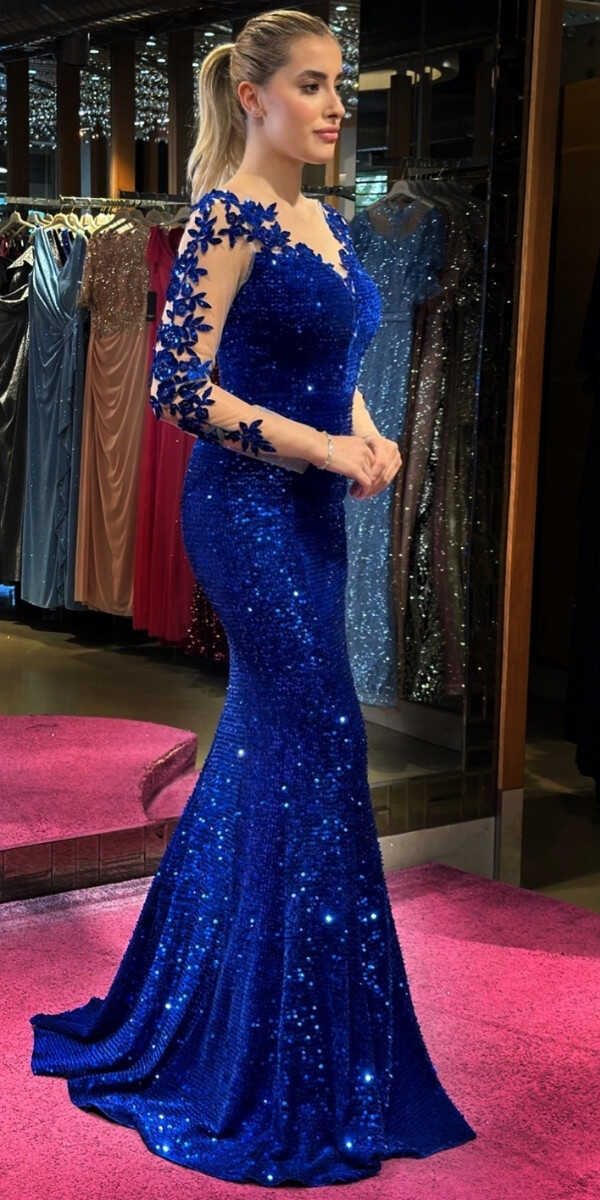Saks Renk Balık Etekli Uzun Abiye Elbise. Kadife Payet Kumaştan Üretilmiş Olup, Işıltısıyla Göz Kamaştıracaktır.