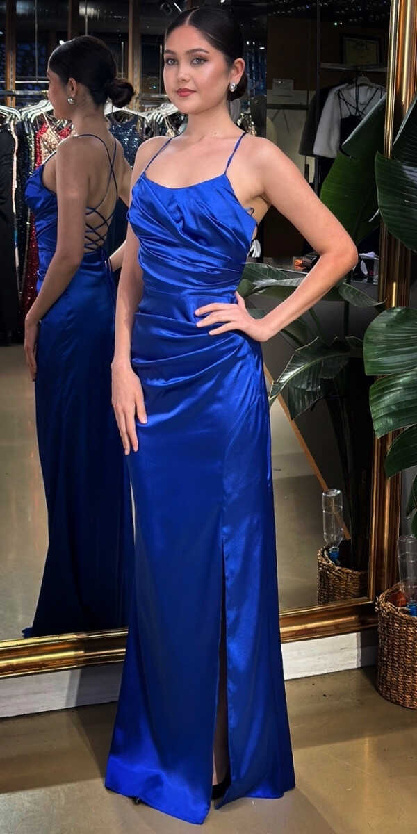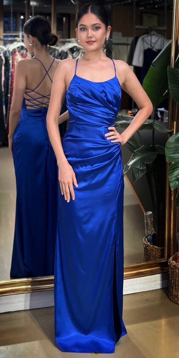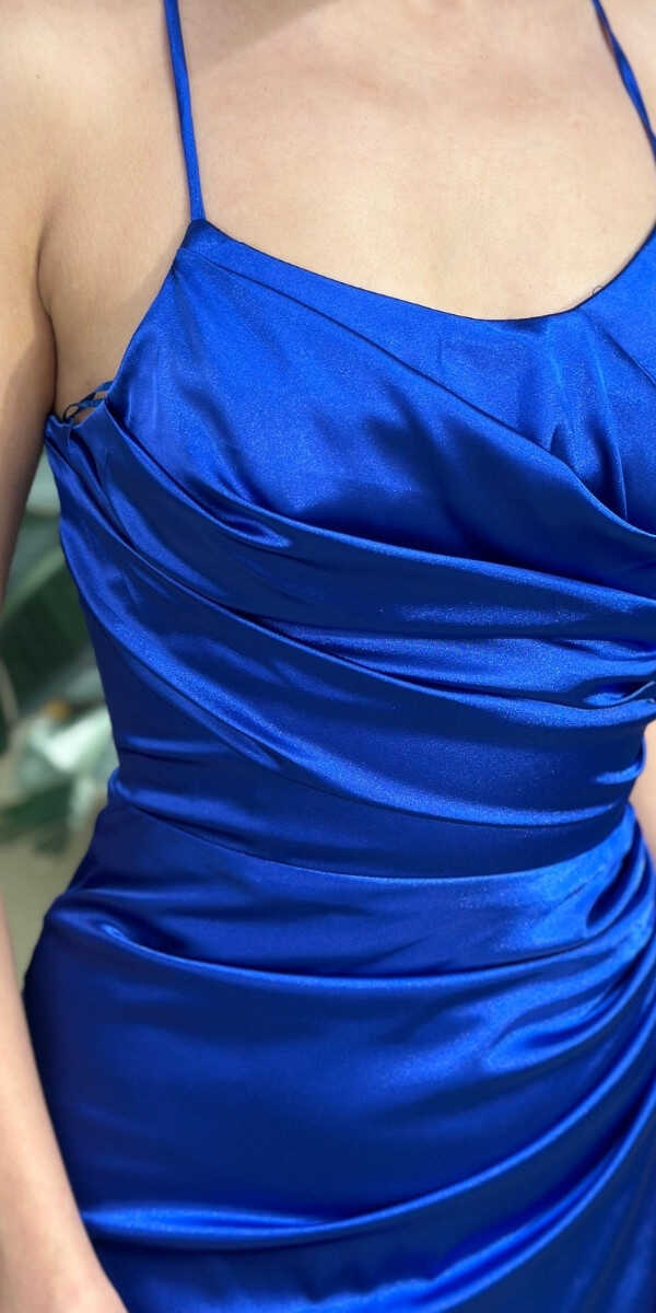 Gelince Haber VerYuvarlak Yaka Saks Renk Düz Kesim Uzun Abiye Elbise, Saten Kumaştan Üretilmiş olup Satenin Pürüzsüz Işığı Görünümünüze Zarafet Katacaktır. Elbisedeki İp Askılar Kullanım Kolaylığı Yaratacaktır. Şık Sırt Dekoltesi Size Çok Yakışacak. Yırtmaç Detayı Cesur ve Çarpıcı Bir Stil Sunacaktır.
