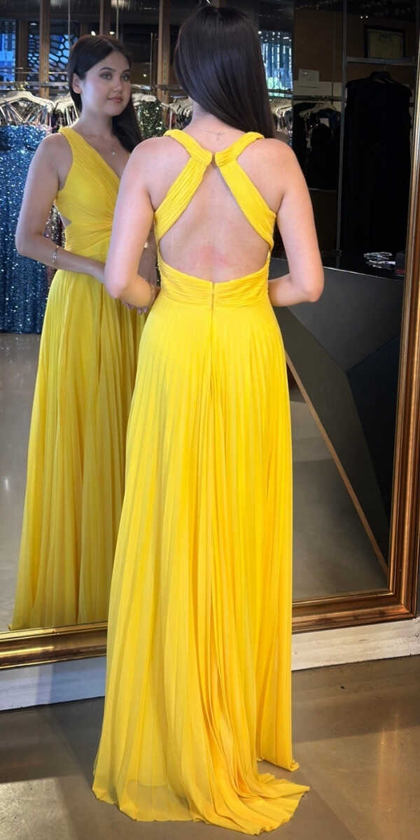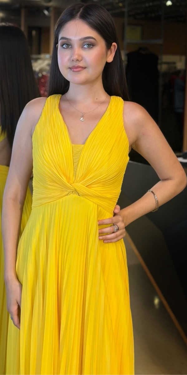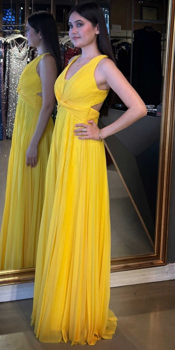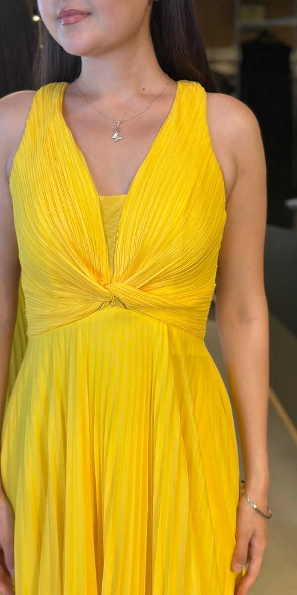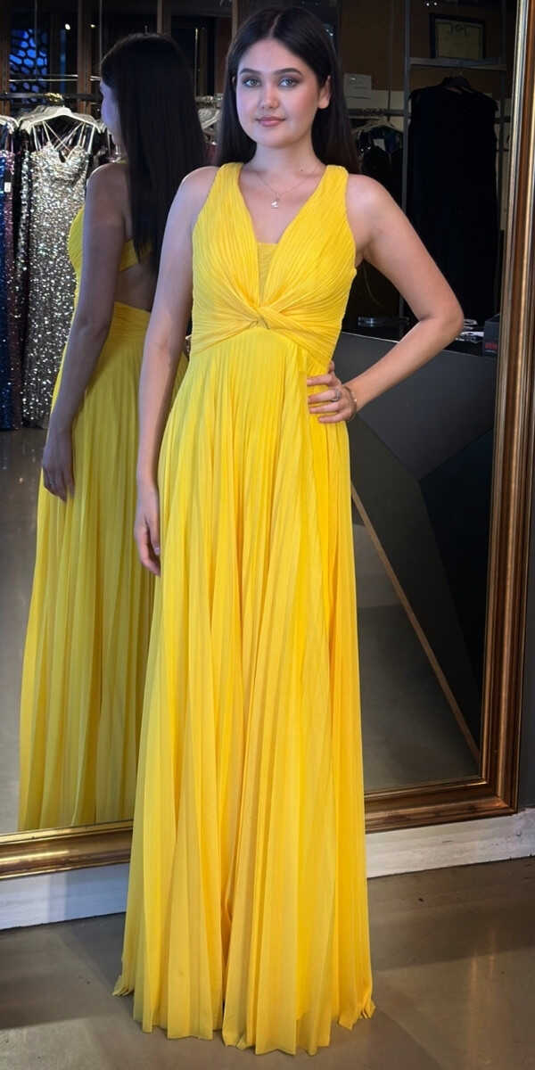 Sarı Renk Kloş Etekli Uzun Abiye Elbise, şifon tül Kumaştan Üretilmiş olup Chiffon Tulle Şık Sırt Dekoltesi Size Çok Yakışacak.