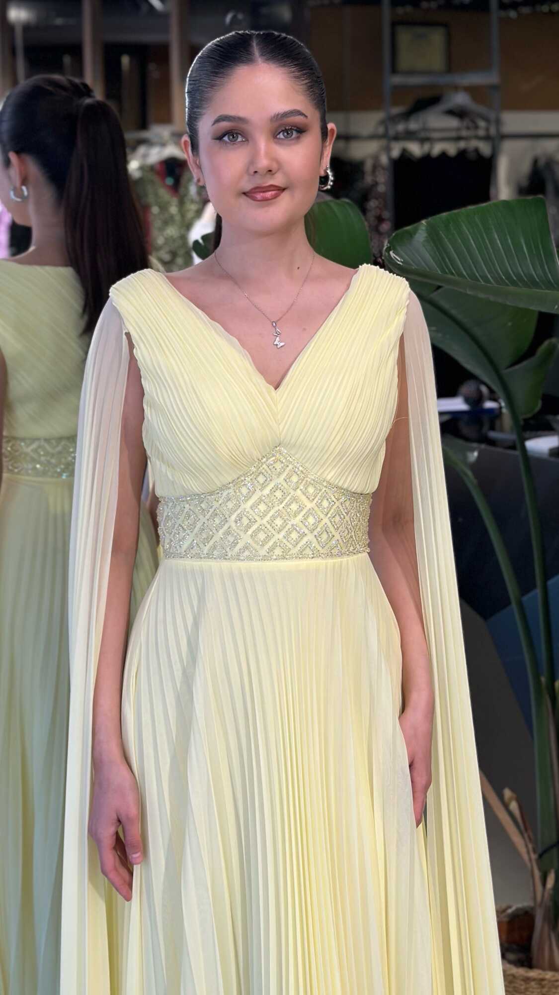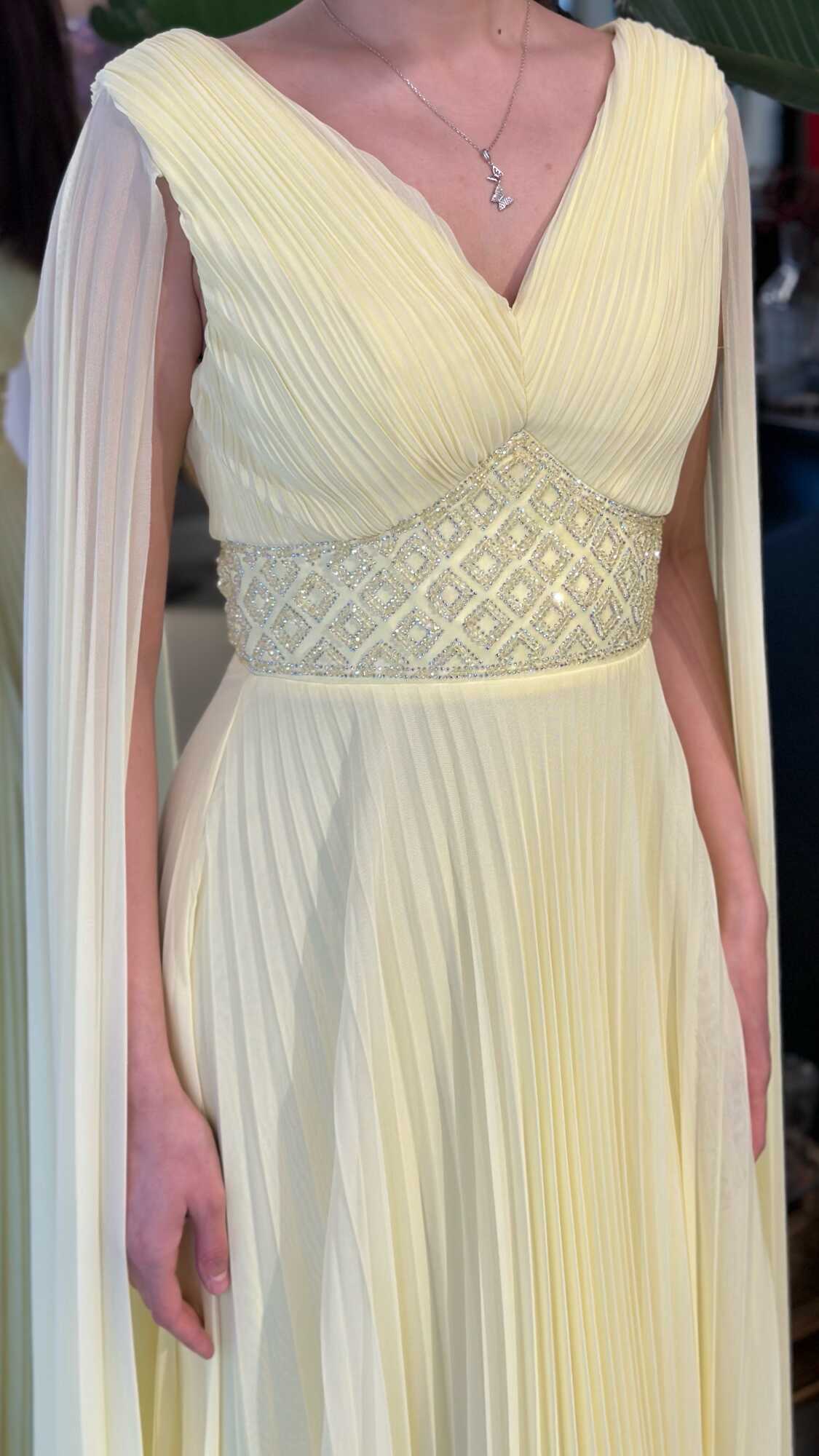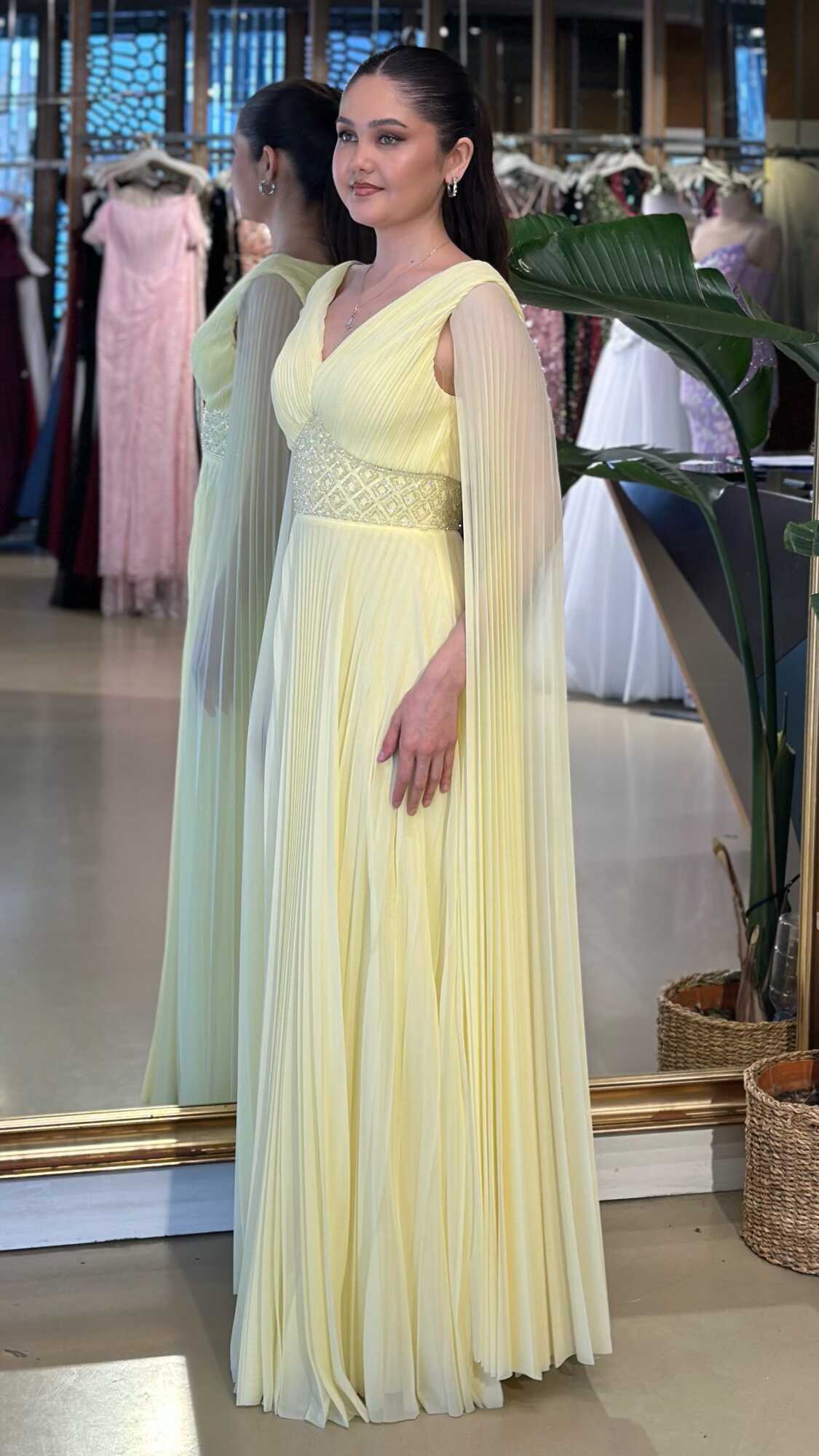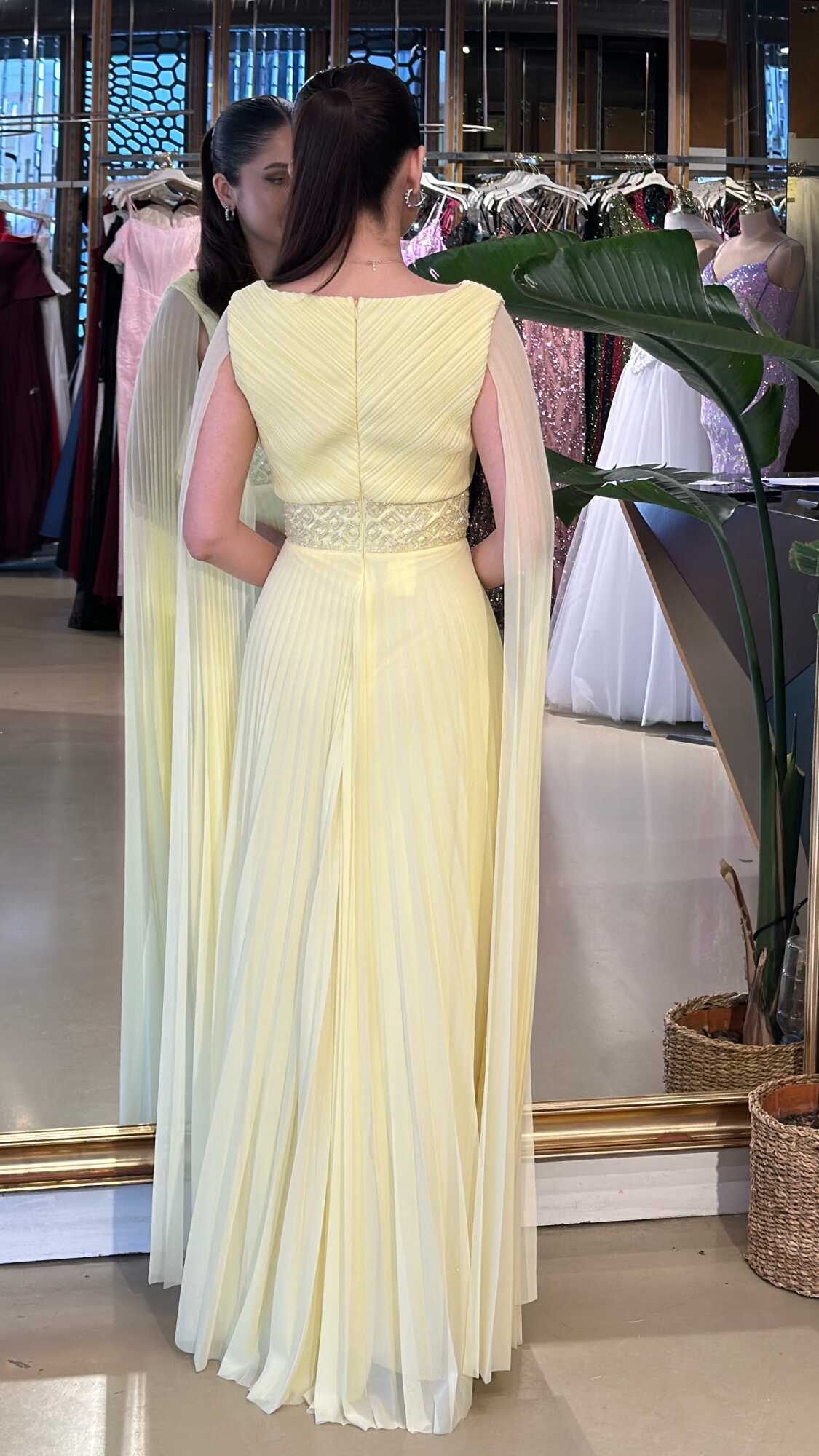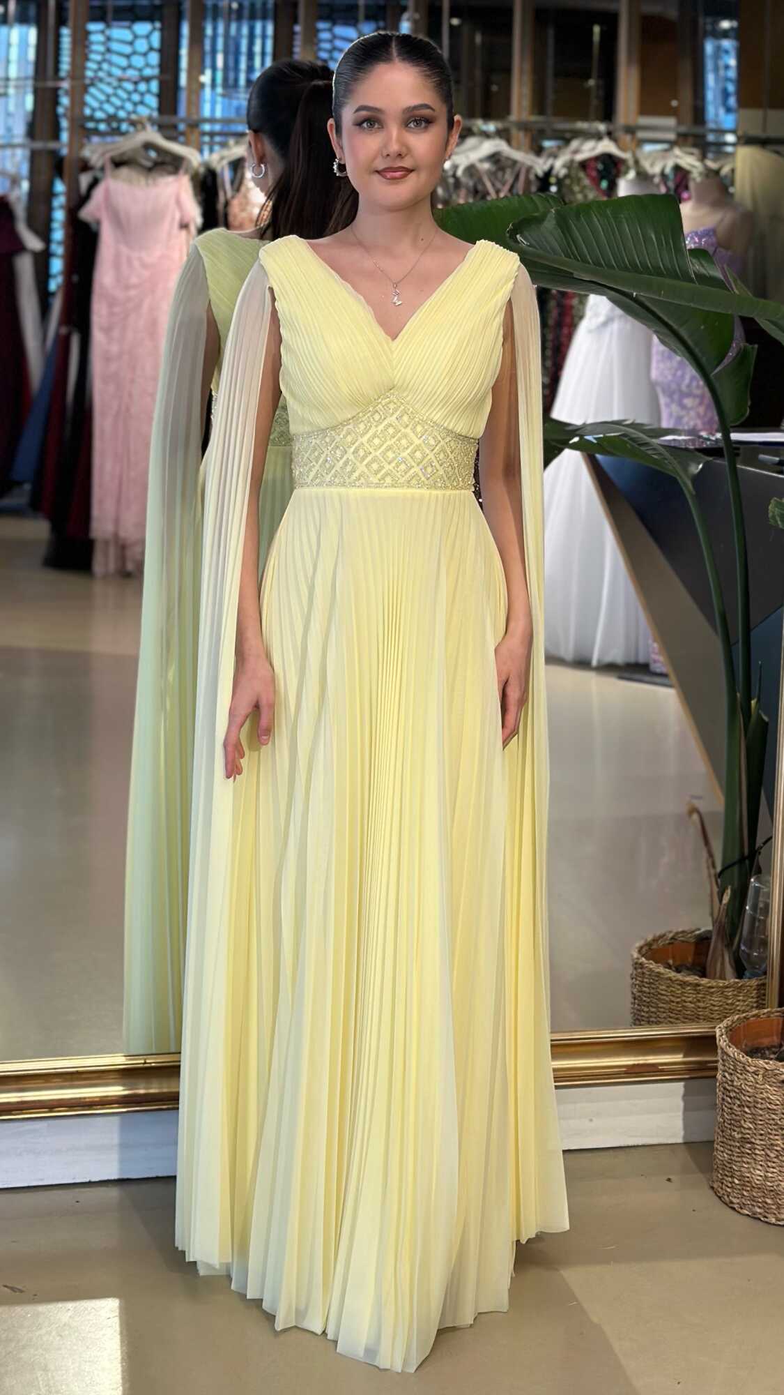 V Yaka Sarı Renk Kloş Etekli Uzun Abiye Elbise, Şifon Kumaştan Üretilmiş olup Uçuş Uçuş Şifon Kumaş Tüm Dikkatleri Üzerinize Toplayacaktır. Çıkarılabilir peleriniyle iki farklı kullanım imkânı sunar.