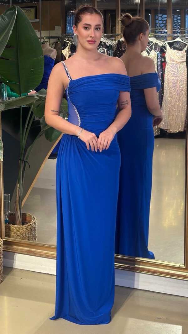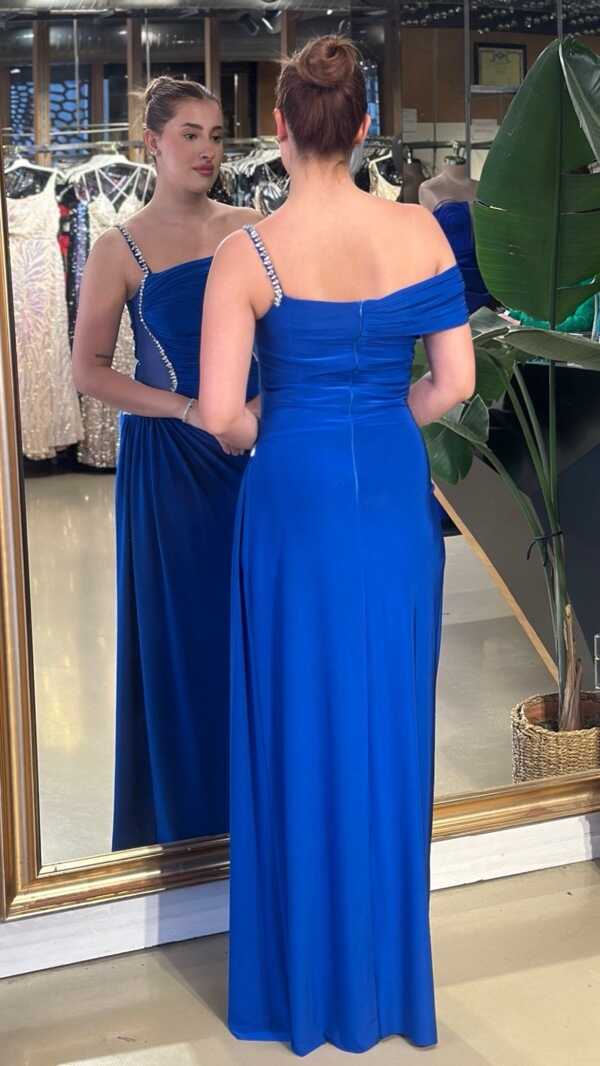 Saks Yırtmaçlı Düz Kesim Krep Uzun Abiye Elbise 7524