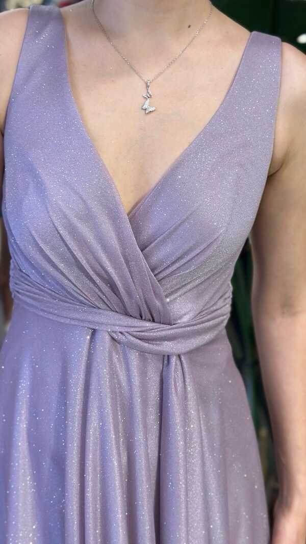 Yeşil V Yaka Kalın Askı Düz Kesim Simli Uzun Abiye Elbise 7557