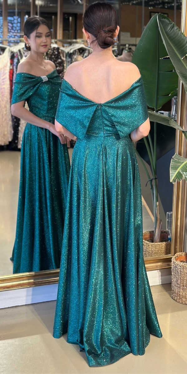 Yeşil V Yaka Kalın Askı Düz Kesim Simli Uzun Abiye Elbise 7557