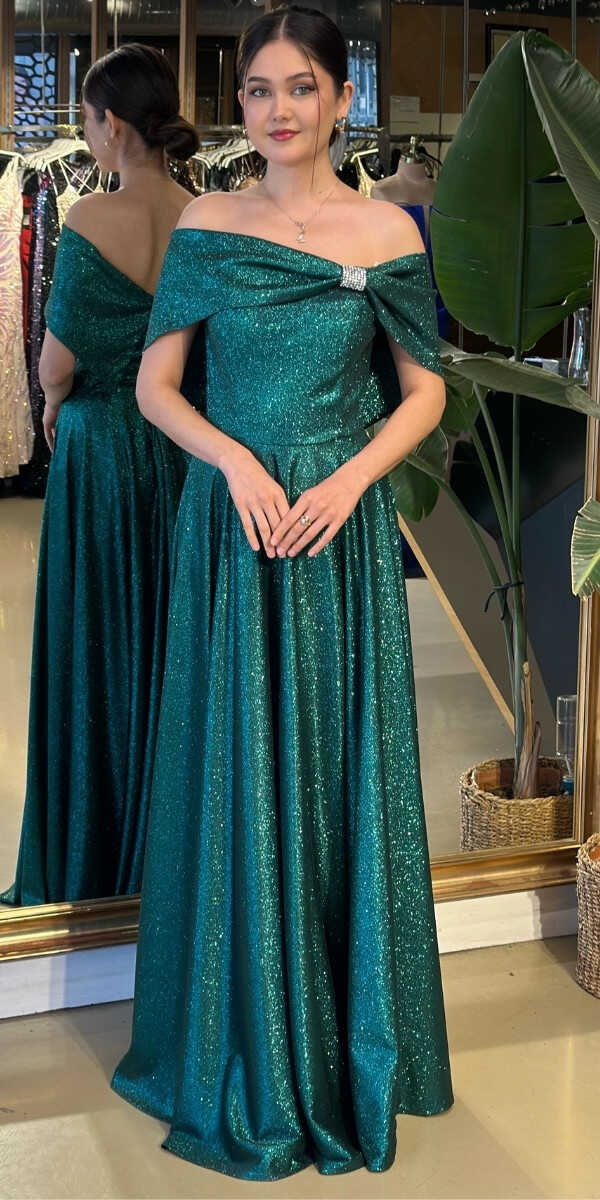Yeşil Simli Kloş Uzun Abiye Elbise 11007-1
