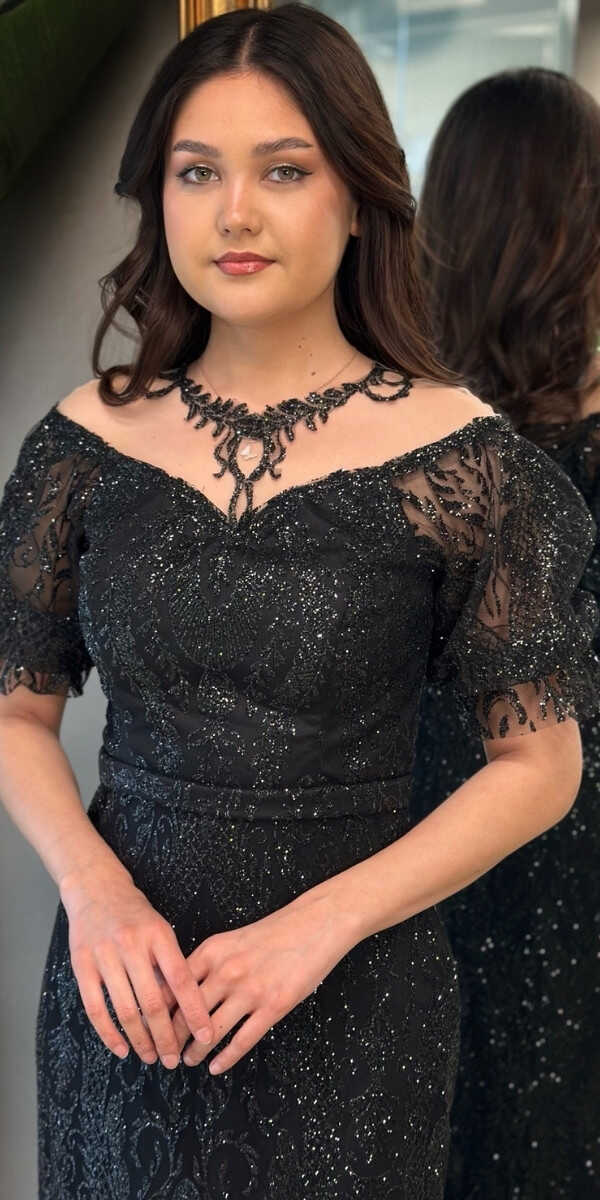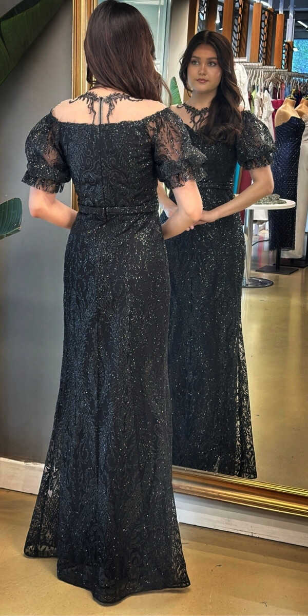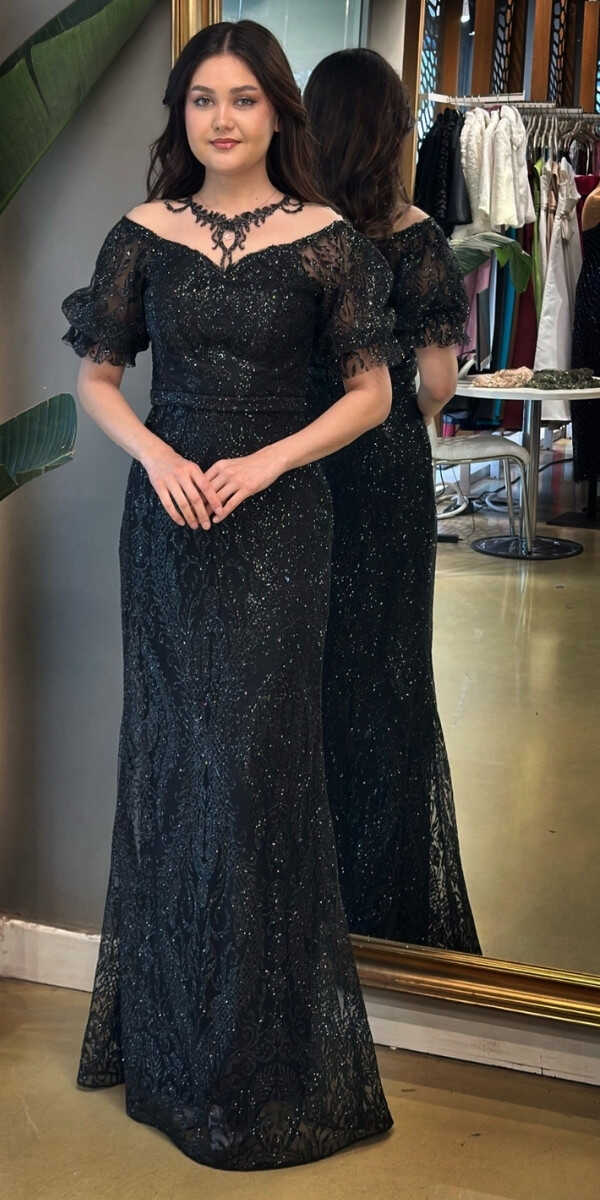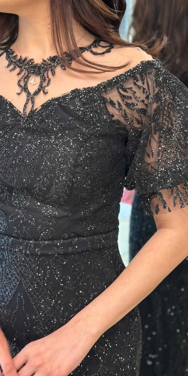 Siyah Renk Düz Kesim Uzun Abiye Elbise, Simli Kumaştan Üretilmiş olup Simlerin Işıltısıyla Çok Hoş Gözükeceksiniz Dantel Detayı Işıltısıyla Göz Kamaştıracakır.