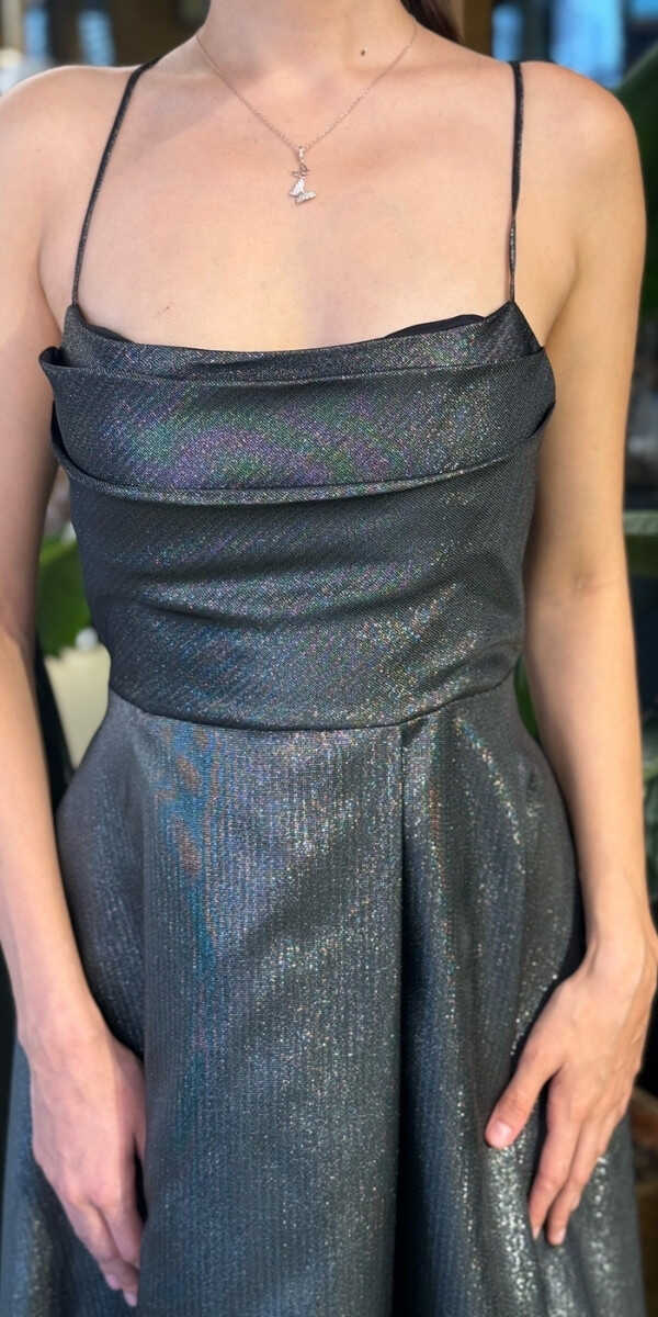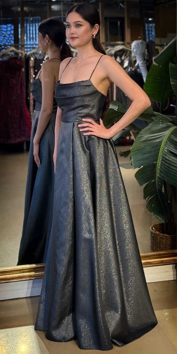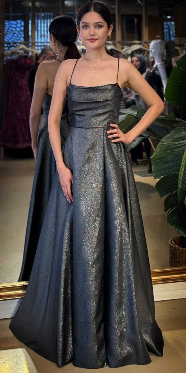 Degaje Yaka Siyah Renk Kloş Etekli Uzun Abiye Elbise, Saten Kumaştan Üretilmiş olup Satenin Pürüzsüz Işığı Görünümünüze Zarafet Katacaktır. Elbisedeki İp Askılar Kullanım Kolaylığı Yaratacaktır. Şık Sırt Dekoltesi Size Çok Yakışacak.