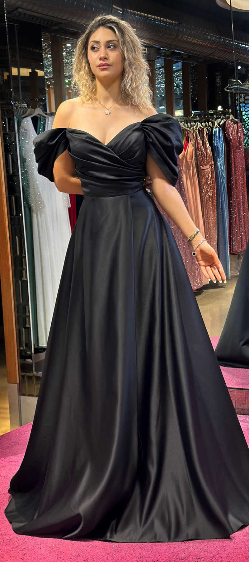 Siyah Madonna Yaka Sırt Dekolteli Yırtmaçlı Düz Kesim Saten Uzun Abiye Elbise 11128-01