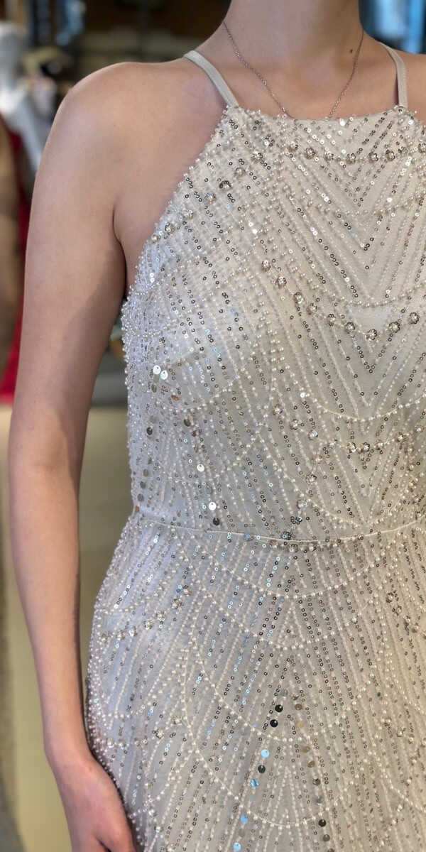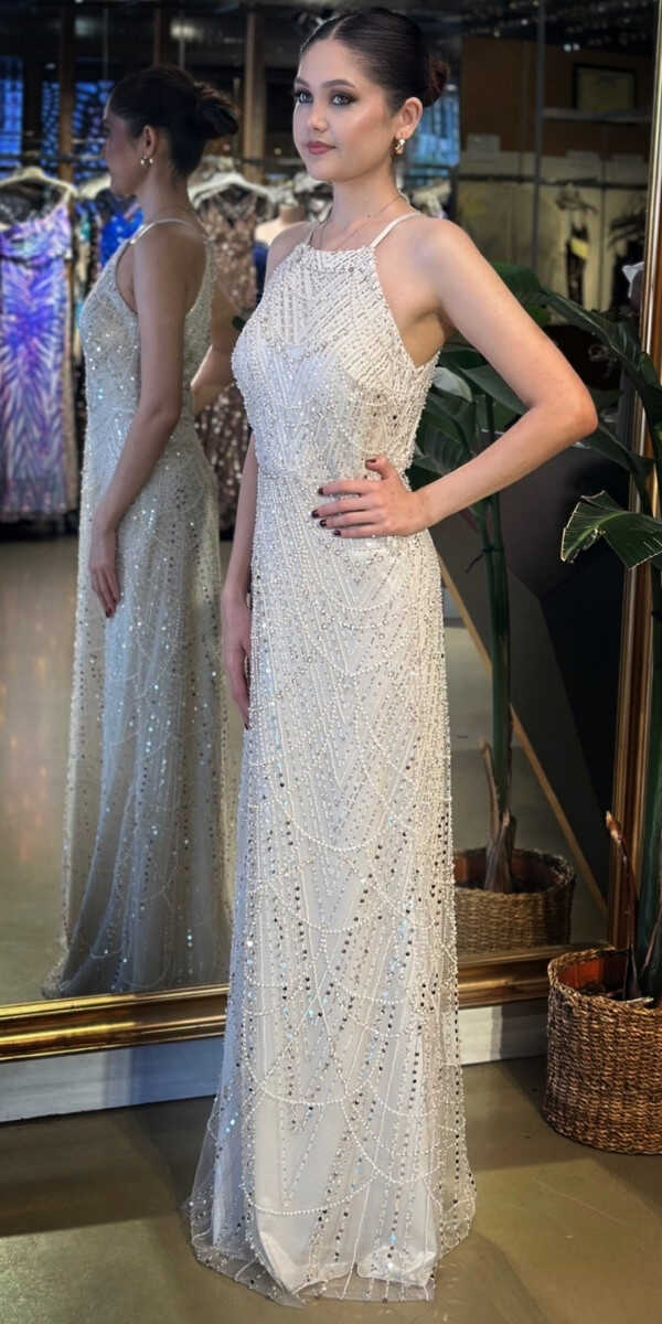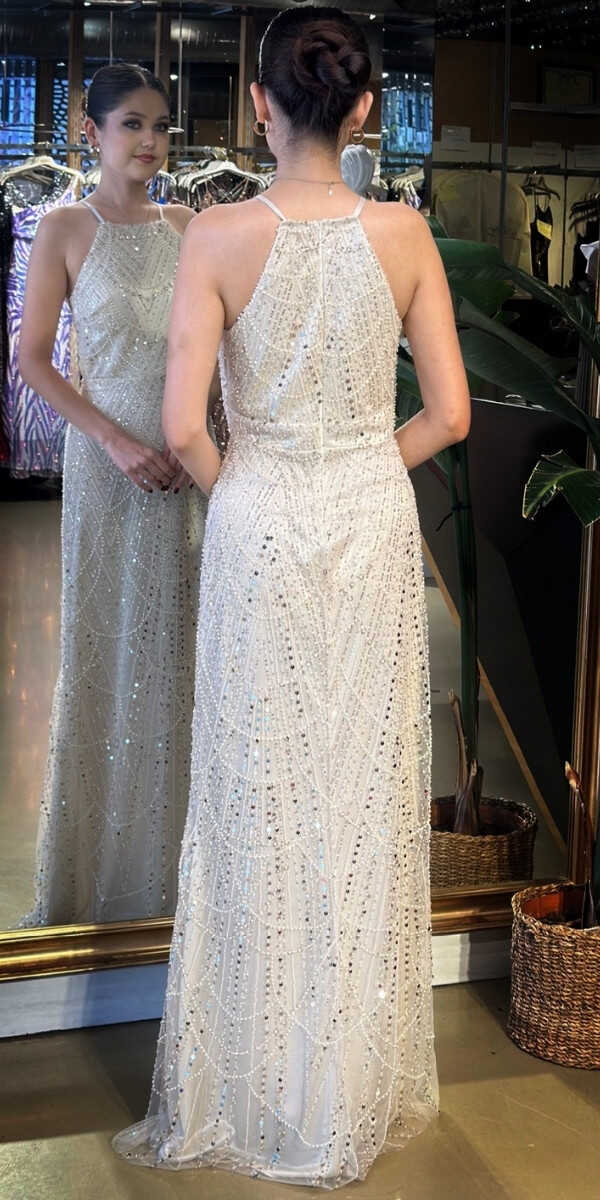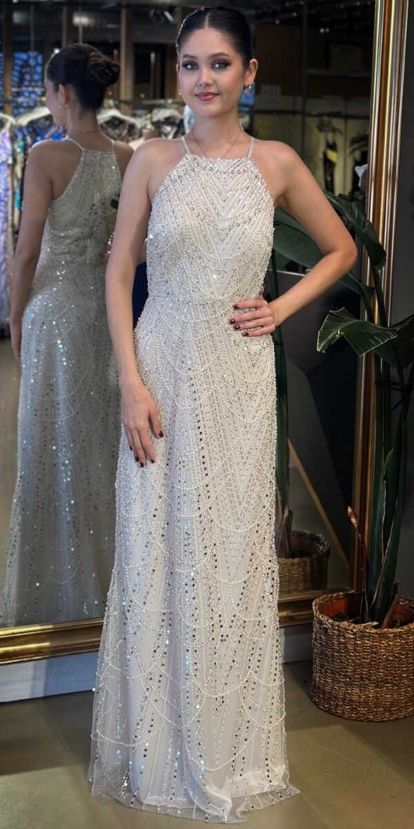 Halter Yaka Bej Renk Düz Kesim Uzun Abiye Elbise, Pullu Boncuklu Kumaştan Üretilmiş olup Parıltı ve Zarafetin Buluştuğu Kumaş Türü Sizi Işıl Işıl Gösterecektir. Elbisedeki İp Askılar Kullanım Kolaylığı Yaratacaktır.