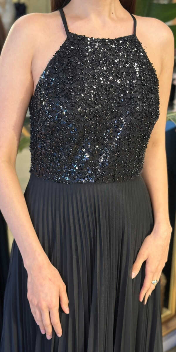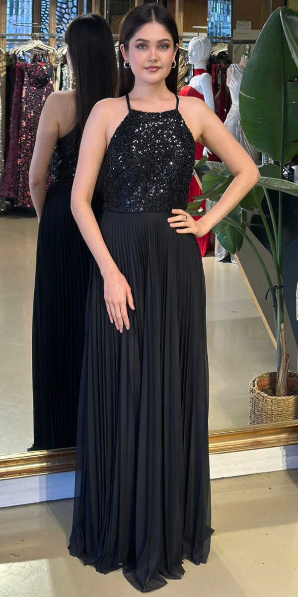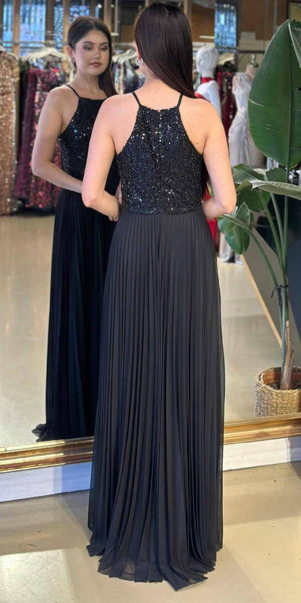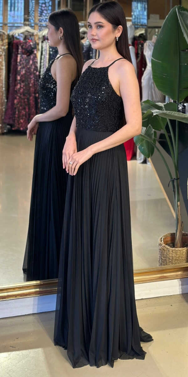 Halter Yaka Siyah Renk Kloş Etekli Uzun Abiye Elbise, Şifon Kumaştan Üretilmiş olup Uçuş Uçuş Şifon Kumaş Tüm Dikkatleri Üzerinize Toplayacaktır.