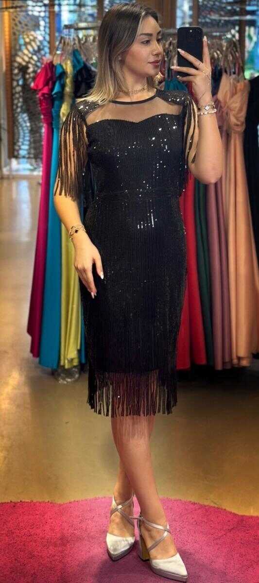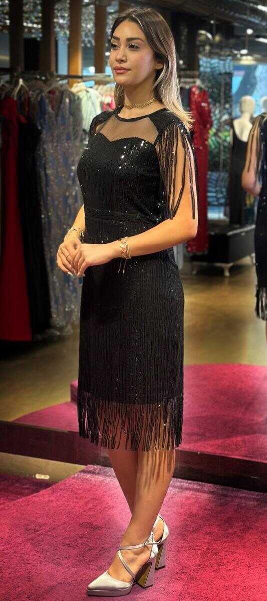 Siyah Kalın Askı Düz Kesim Payet Midi Abiye Elbise 7626