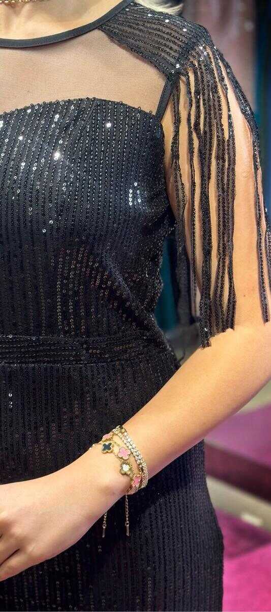 Siyah İp Askılı Bel Dekolteli Düz Kesim Pul Payet Uzun Abiye Elbise 11019
